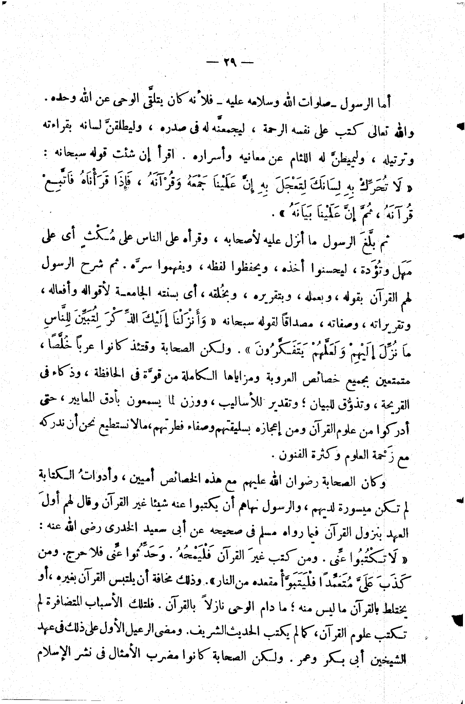 وكان الصحابة رضوان الله عليهم مع هذه الخصائص أميين وأدوات الكتابة لم تكن ميسورة لديهم والرسول نهاهم أن يكتبوا عنه شيئا غير القرآن وقال لهم أول العهد بنزول القرآن فيما رواه مسلم في صحيحه عن أبي سعيد الخدري رضي الله عنه: "لا تكتبوا عني. ومن كتب غير القرآن فليمحه. وحدثوا عني فلا حرج. ومن كذب علي متعمدا فليتبوأ مقعده من النار". وذلك مخافة أن يلتبس القرآن بغيره أو يختلط بالقرآن ما ليس منه ما دام الوحي نازلا بالقرآن. فلتلك الأسباب المتضافرة لم تكتب علوم القرآن كما لم يكتب الحديث الشريف. ومضى الرعيل الأول على ذلك في عهد الشيخين أبي بكر وعمر. ولكن الصحابة كانوا مضرب الأمثال في نشر الإسلام وتعاليمه والقرآن وعلومه والسنة وتحريرها تلقينا لا تدوينا ومشافهة لا كتابة.