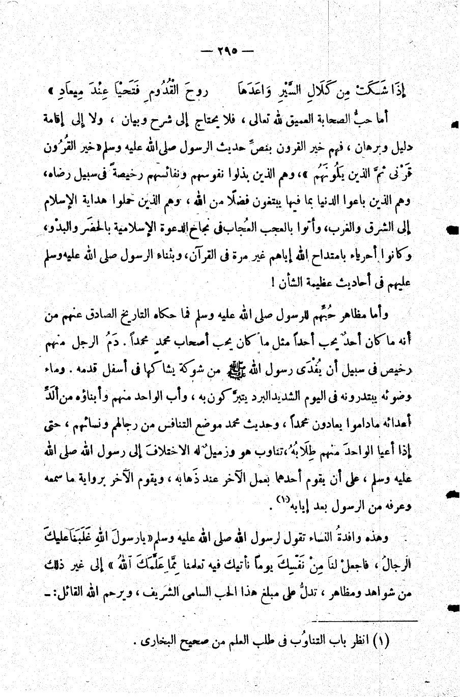 وهذه وافدة النساء تقول لرسول الله صلى الله عليه وسلم يا رسول الله غلبنا عليك الرجال فاجعل لنا من نفسك يوما نأتيك فيه تعلمنا مما علمك الله إلى غير ذلك من شواهد ومظاهر تدل على مبلغ هذا الحب السامي الشريف ويرحم الله القائل:-