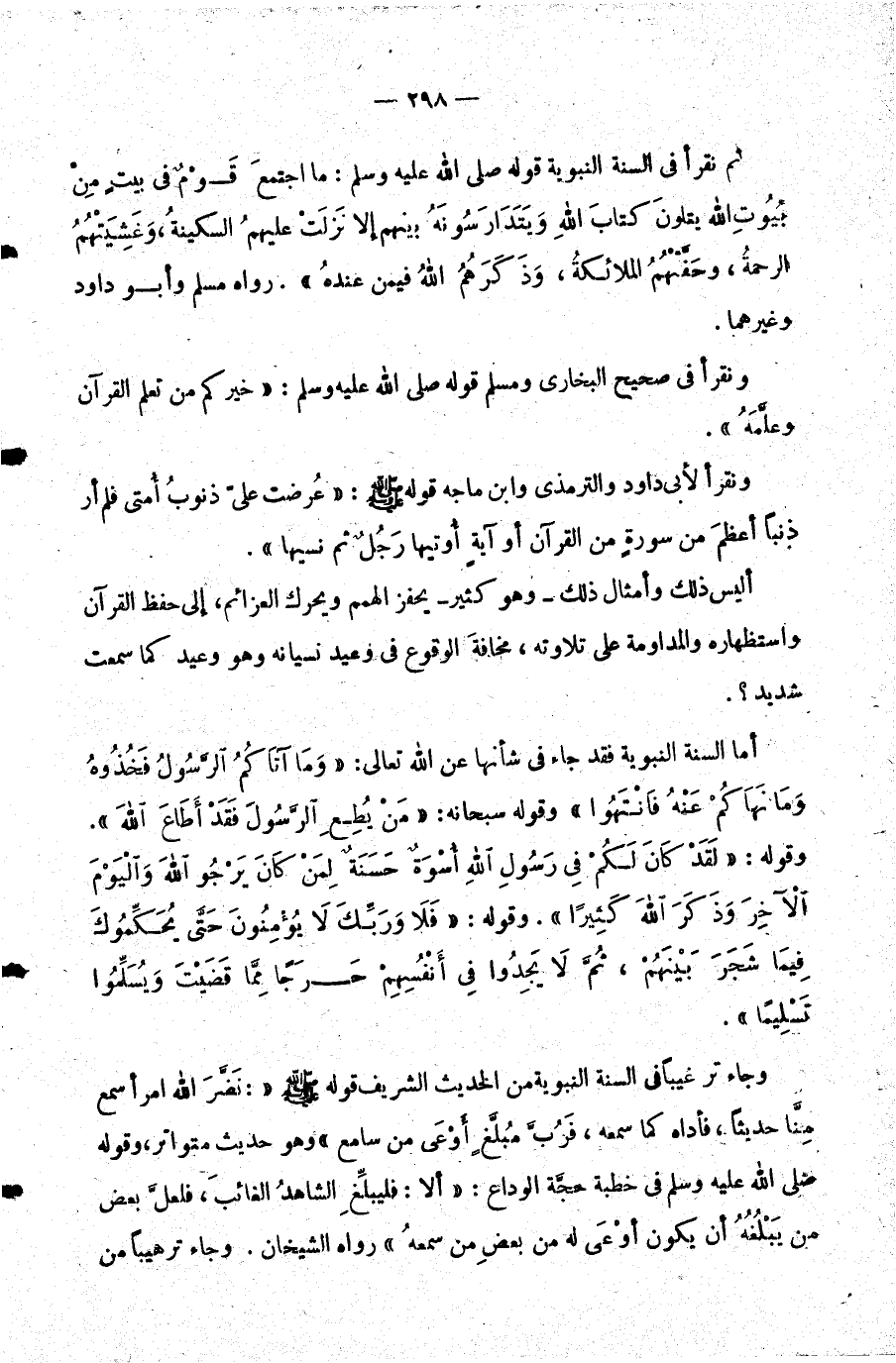 أما السنة النبوية فقد جاء في شأنها عن الله تعالى: {وَمَا آتَاكُمُ الرَّسُولُ فَخُذُوهُ وَمَا نَهَاكُمْ عَنْهُ فَانْتَهُوا} وقوله سبحانه: {مَنْ يُطِعِ الرَّسُولَ فَقَدْ أَطَاعَ اللَّهَ} . وقوله: {لَقَدْ كَانَ لَكُمْ فِي رَسُولِ اللَّهِ أُسْوَةٌ حَسَنَةٌ لِمَنْ كَانَ يَرْجُو اللَّهَ وَالْيَوْمَ الْآخِرَ وَذَكَرَ اللَّهَ كَثِيراً} . وقوله: {فَلا وَرَبِّكَ لا يُؤْمِنُونَ حَتَّى يُحَكِّمُوكَ فِيمَا شَجَرَ بَيْنَهُمْ ثُمَّ لا يَجِدُوا فِي أَنْفُسِهِمْ حَرَجاً مِمَّا قَضَيْتَ وَيُسَلِّمُوا تَسْلِيماً} .