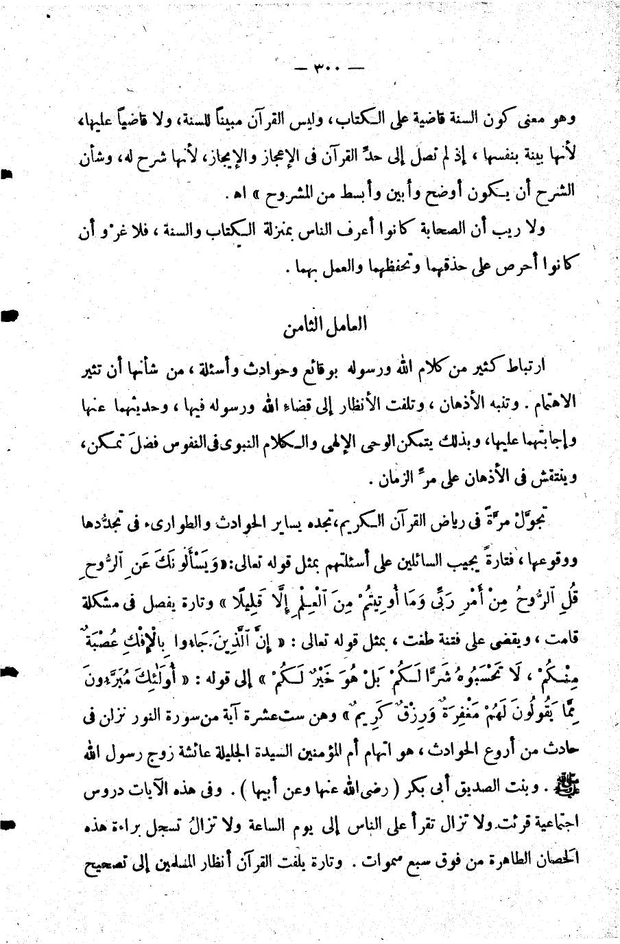 تجول مرة في رياض القرآن الكريم تجده يساير الحوادث والطوارئ في تجددها ووقوعها فتارة يجيب السائلين على أسئلتهم بمثل قوله تعالى: {وَيَسْأَلونَكَ عَنِ الرُّوحِ قُلِ الرُّوحُ مِنْ أَمْرِ رَبِّي وَمَا أُوتِيتُمْ مِنَ الْعِلْمِ إِلَّا قَلِيلاً} وتارة يفصل في مشكلة قامت ويقضي على فتنة طغت بمثل قوله تعالى: {إِنَّ الَّذِينَ جَاءُوا بِالْأِفْكِ عُصْبَةٌ مِنْكُمْ لا تَحْسَبُوهُ شَرّاً لَكُمْ بَلْ هُوَ خَيْرٌ لَكُمْ} إلى قوله: {أُولَئِكَ مُبَرَّأُونَ مِمَّا يَقُولُونَ لَهُمْ مَغْفِرَةٌ وَرِزْقٌ كَرِيمٌ} وهن ست عشرة آية من سورة النور نزلن في حادث من أروع الحوادث هو اتهام أم المؤمنين السيدة الجليلة عائشة زوج رسول الله صلى الله عليه وسلم. وبنت الصديق أبي بكر رضي الله عنها وعن أبيها. وفي هذه الآيات دروس اجتماعية قرئت ولا تزال تقرأ على الناس إلى يوم الساعة ولا تزال تسجل براءة هذه الحصان الطاهرة من فوق سبع سموات. وتارة يلفت القرآن أنظار المسلمين إلى تصحيح