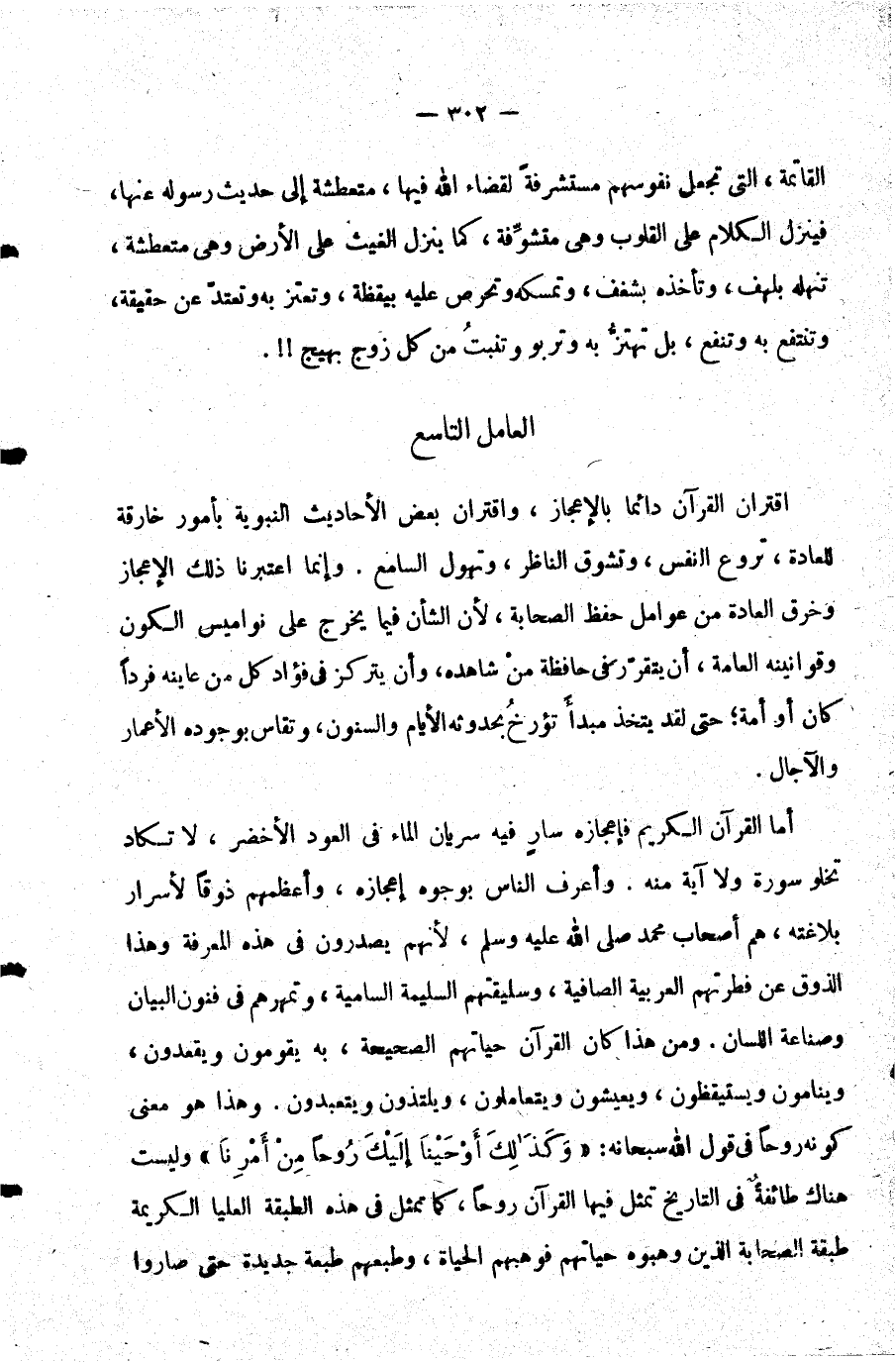 أما القرآن الكريم فإعجازه سار فيه سريان الماء في العود الأخضر لا تكاد تخلو سورة ولا آية منه. وأعرف الناس بوجوه إعجازه وأعظمهم ذوقا لأسرار بلاغته هم أصحاب محمد صلى الله عليه وسلم لأنهم يصدرون في هذه المعرفة وهذا الذوق عن فطرتهم العربية الصافية وسليقتهم السليمة السامية وتمهرهم في فنون البيان وصناعة اللسان. ومن هذا كان القرآن حياتهم الصحيحة به يقومون ويقعدون وينامون ويستيقظون ويعيشون ويتعاملون ويلتذون ويتعبدون. وهذا هو معنى كونه روحا في قول الله سبحانه: {وَكَذَلِكَ أَوْحَيْنَا إِلَيْكَ رُوحاً مِنْ أَمْرِنَا} وليست هناك طائفة في التاريخ تمثل فيها القرآن روحا كما تمثل في هذه الطبقة العليا الكريمة طبقة الصحابة الذين وهبوه حياتهم فوهبهم الحياة وطبعهم طبعة جديدة حتى صاروا