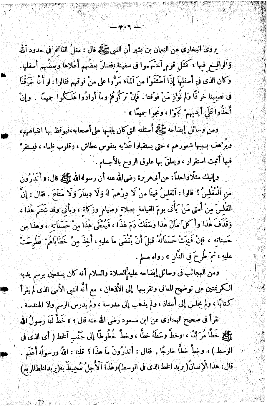 نقرأ في صحيح البخاري عن ابن مسعود رضي الله عنه قال: خط لنا رسول الله صلى الله عليه وسلم خطا مربعا وخط وسطه خطا وخط خطوطا إلى جنب الخط أي الذي في الوسط وخط خطا خارجا. فقال: "أتدرون ما هذا؟ " قلنا: الله ورسوله أعلم. قال: "هذا الإنسان يريد الخط الذي في الوسط وهذا الأجل محيط به يريد الخط المربع