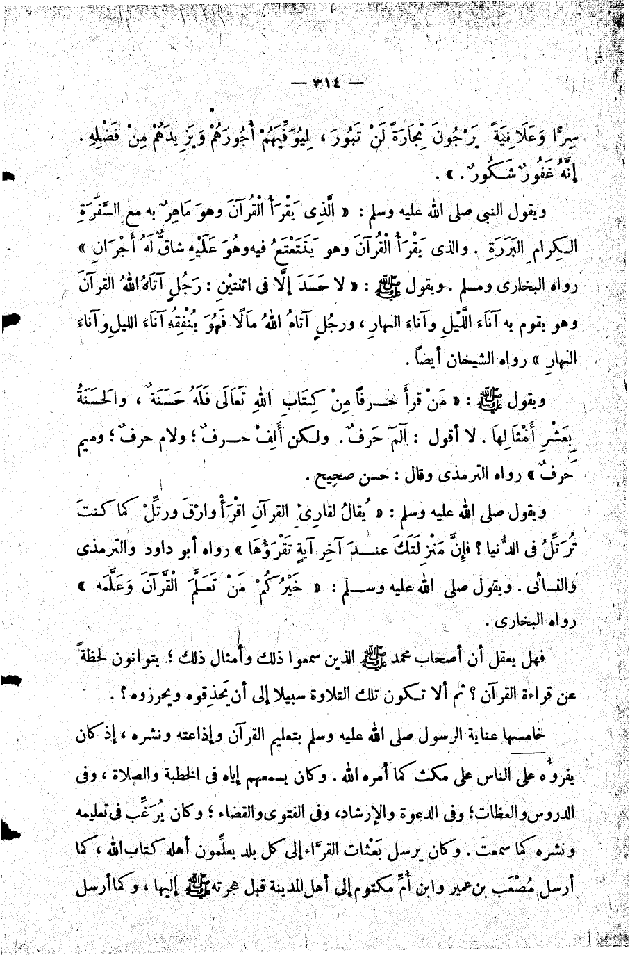 ويقول صلى الله عليه وسلم: "يقال لقارئ القرآن اقرأ وارق ورتل كما كنت ترتل في الدنيا؟ فإن منزلتك عند آخر آية تقرؤها" رواه أبو داود والترمذي والنسائي. ويقول صلى الله عليه وسلم: "خيركم من تعلم القرآن وعلمه" رواه البخاري.