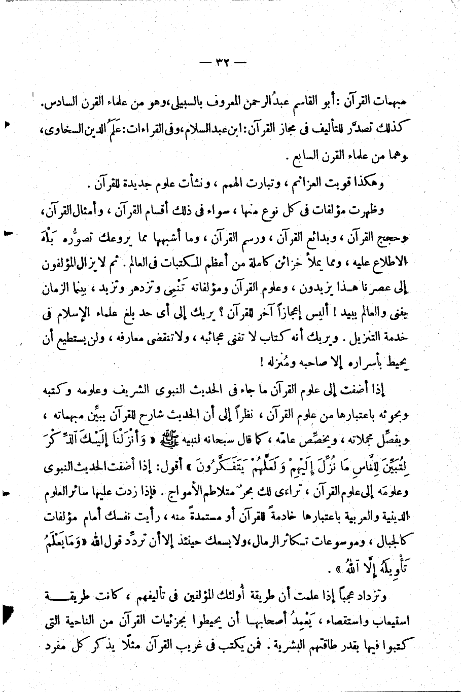 وظهرت مؤلفات في كل نوع منها سواء في ذلك أقسام القرآن وأمثال القرآن وحجج القرآن وبدائع القرآن ورسم القرآن وما أشبهها مما يروعك تصوره بله الاطلاع عليه ومما يملأ خزائن كاملة من أعظم المكتبات في العالم. ثم لا يزال المؤلفون إلى عصرنا هذا يزيدون وعلوم القرآن ومؤلفاته تنمى وتزدهر وتزيد بينما الزمان يفنى والعالم يبيد أليس إعجازا آخر للقرآن؟ يريك إلى أي حد بلغ علماء الإسلام في خدمة التنزيل. ويريك أنه كتاب لا تفنى عجائبه ولا تنقضي معارفه ولن يستطيع أن يحيط بأسراره إلا صاحبه ومنزله!