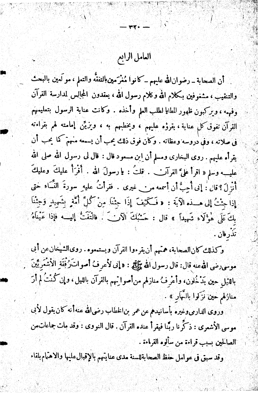 أن الصحابة رضوان الله عليهم كانوا مغرمين بالتفقه والتعلم مولعين بالبحث. والتنقيب مشغوفين بكلام الله وكلام رسول الله يعقدون المجالس لمدارسة القرآن وفهمه ويركبون ظهور المطايا لطلب العلم وأخذه. وكانت عناية الرسول بتعليمهم القرآن تفوق كل عناية يقرؤه عليهم ويخطبهم به ويزين إمامته لهم بقراءته في صلاته وفي دروسه وعظاته. وكان فوق ذلك يحب أن يسمعه منهم كما يحب أن يقرأه عليهم. روى البخاري ومسلم أن ابن مسعود قال: قال لي رسول الله صلى الله عليه وسلم: "اقرأ علي القرآن". قلت: يا رسول الله. أقرأ عليك وعليك أنزل؟ قال: "إني أحب أن أسمعه من غيري". فقرأت عليه سورة النساء حتى إذا جئت إلى هذه الآية: {فَكَيْفَ إِذَا جِئْنَا مِنْ كُلِّ أُمَّةٍ بِشَهِيدٍ وَجِئْنَا بِكَ عَلَى هَؤُلاءِ شَهِيداً} قال: "حسبك الآن" فالتفت إليه فإذا عيناه تذرفان.