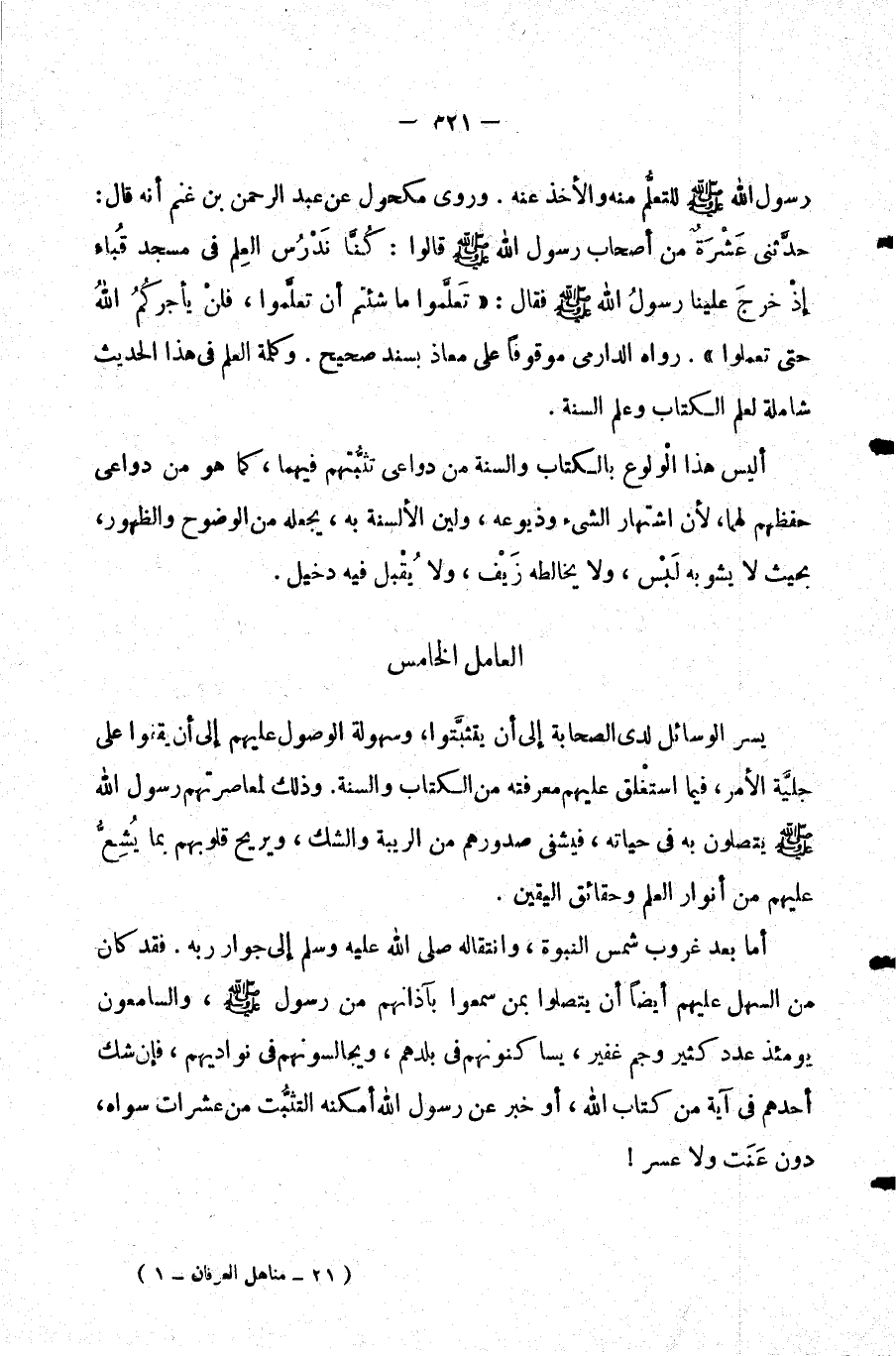 رسول الله صلى الله عليه وسلم للتعلم منه والأخذ عنه. وروى مكحول عن عبد الرحمن بن غنم أنه قال: حدثني عشرة من أصحاب رسول الله صلى الله عليه وسلم قالوا: كنا ندرس العلم في مسجد قباء إذ خرج علينا رسول الله صلى الله عليه وسلم فقال: "تعلموا ما شتئم أن تعلموا فلن يأجركم الله حتى تعملوا". رواه الدارمي موقوما على معاذ بسند صحيح. وكلمة العلم في هذا الحديث شاملة لعلم الكتاب وعلم السنة.