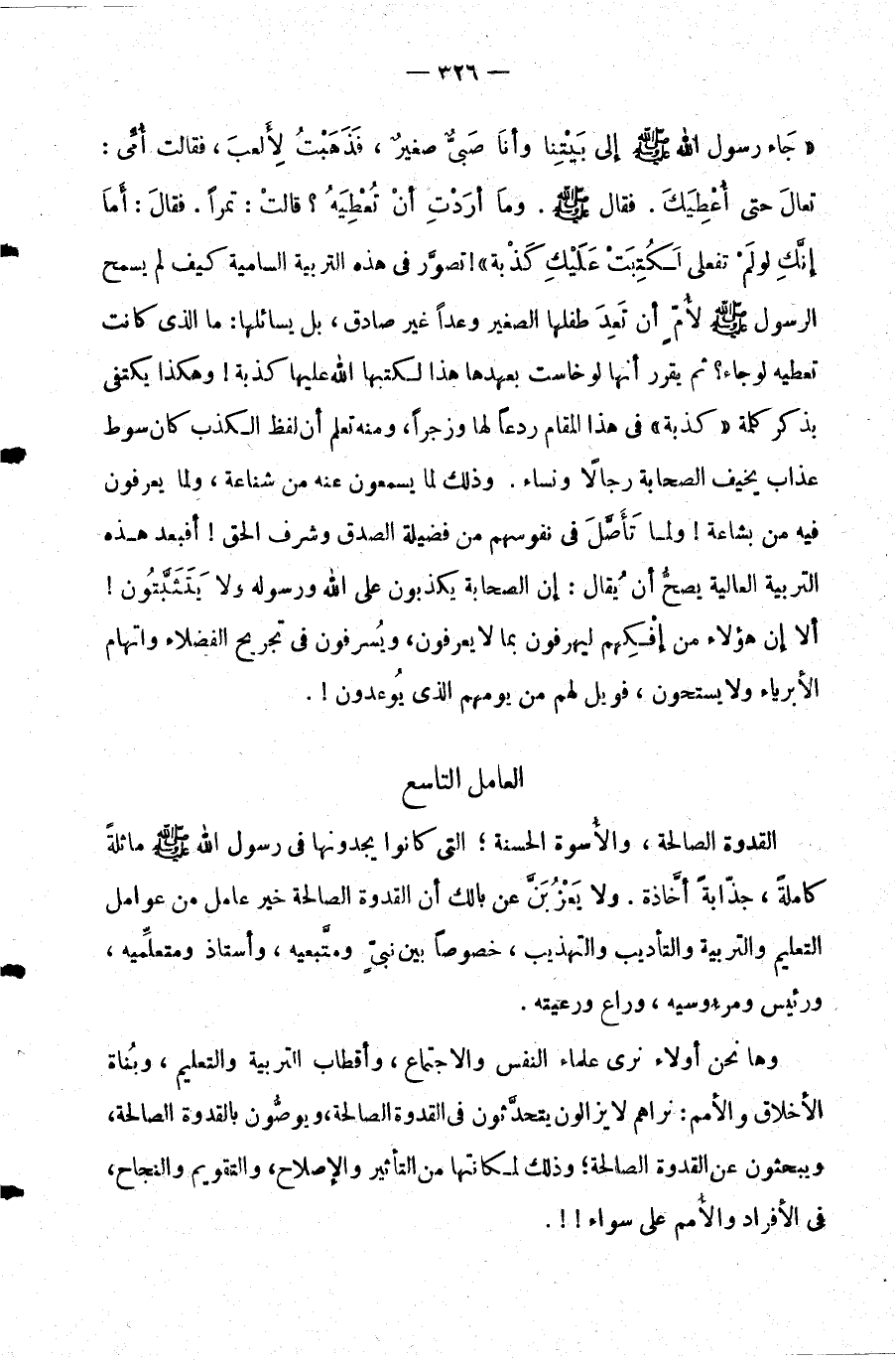 جاء رسول الله صلى الله عليه وسلم إلى بيتنا وأنا صبي صغير فذهبت لألعب فقالت أمي: تعال حتى أعطيك. فقال صلى الله عليه وسلم. "وما أردت أن تعطيه؟ قالت: تمرا. فقال: أما إنك لو لم تفعلي لكتبت عليك كذبة" تصور في هذه التربية السامية كيف لم يسمح الرسول صلى الله عليه وسلم لأم أن تعد طفلها الصغير وعدا غير صادق بل يسائلها: ما الذي كانت تعطيه لو جاء؟ ثم يقرر أنها لو خاست بعهدها هذا لكتبها الله عليها كذبة وهكذا يكتفي بذكر كلمة كذبة في هذا المقام ردعا لها وزجرا ومنه تعلم أن لفظ الكذب كان سوط عذاب يخيف الصحابة رجالا ونساء. وذلك لما يسمعون عنه من شناعة ولما يعرفون فيه من بشاعة ولما تأصل في نفوسهم من فضيلة الصدق وشرف الحق أفبعد هذه التربية العالية يصح أن يقال: إن الصحابة يكذبون على الله ورسوله ولا يتثبتون ألا إن هؤلاء من إفكهم ليهرفون بما لا يعرفون ويسرفون في تجريح الفضلاء واتهام الأبرياء ولا يستحون فويل لهم من يومهم الذي يوعدون.