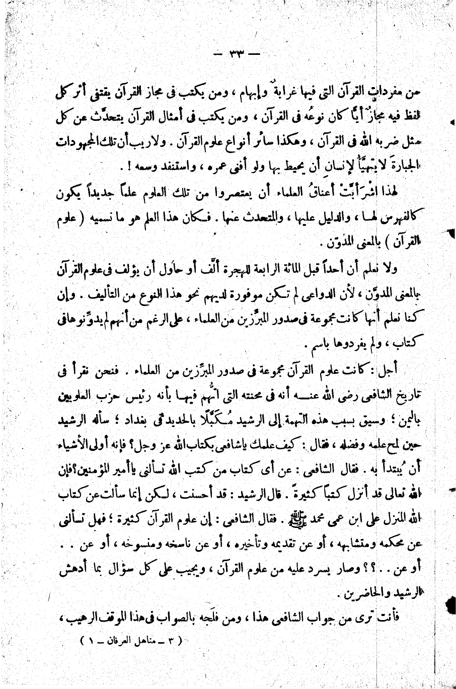 أجل: كانت علوم القرآن مجموعة في صدور المبرزين من العلماء. فنحن نقرأ في تاريخ الشافعي رضي الله عنه أنه في محنته التي اتهم فيها بأنه رئيس حزب العلويين باليمن وسيق بسبب هذه التهمة إلى الرشيد مكبلا بالحديد في بغداد سأله الرشيد حين لمح علمه وفضله فقال: كيف علمك يا شافعي بكتاب الله عز وجل فإنه أولى الأشياء أن يبتدأ به. فقال الشافعي: عن أي كتاب من كتب الله تسألني يا أمير المؤمنين؟ فإن الله تعالى قد أنزل كتبا كثيرة. قال الرشيد: قد أحسنت لكن إنما سألت عن كتاب الله المنزل على ابن عمي محمد صلى الله عليه وسلم. فقال الشافعي: إن علوم القرآن كثيرة فهل تسألني عن محكمه ومتشابهه أو عن تقديمه وتأخيره أو عن ناسخه ومنسوخه أو عن؟؟ أو عن وصار يسرد عليه من علوم القرآن ويجيب على كل سؤال بما أدهش الرشيد والحاضرين.