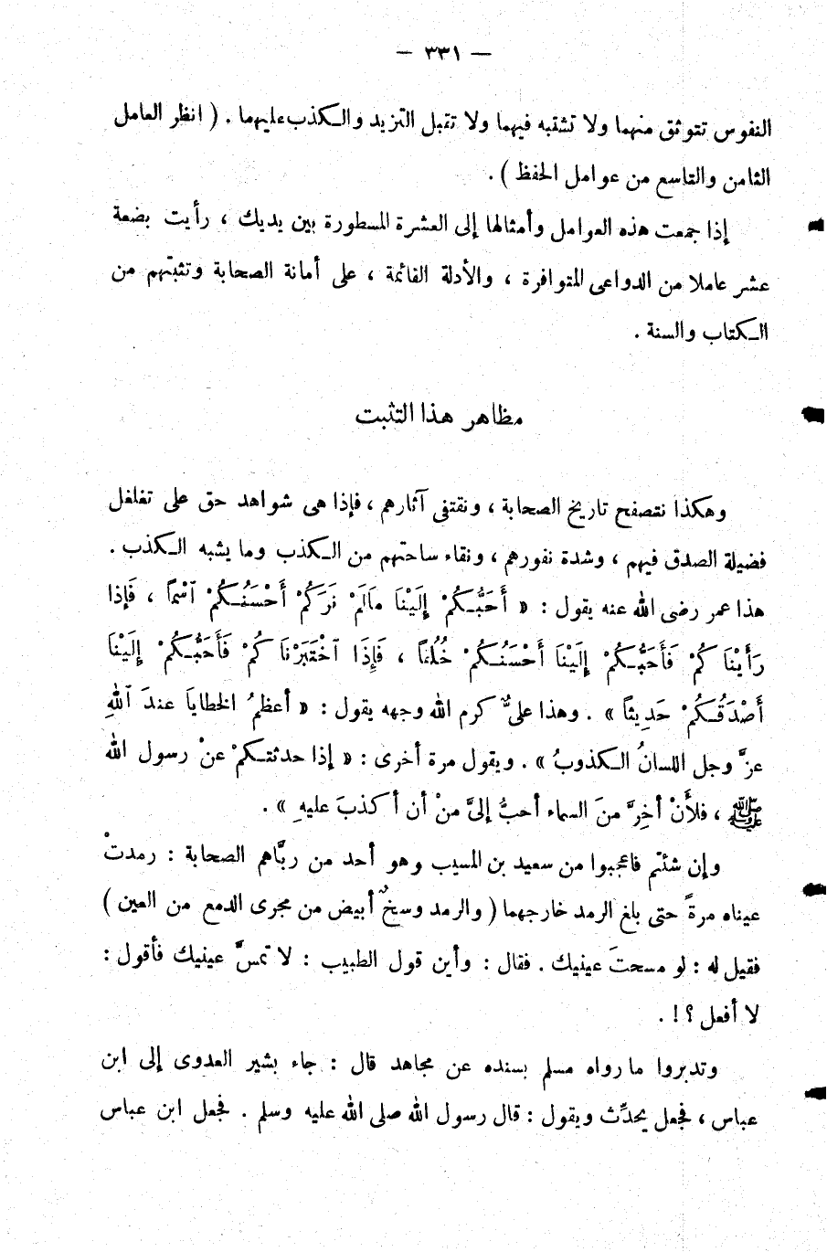 إذا جمعت هذه العوامل وأمثالها إلى العشرة المسطورة بين يديك رأيت بضعة عشر عاملا من الدواعي المتوافرة والأدلة القائمة على أمانة الصحابة وتثبتهم من الكتاب والسنة.