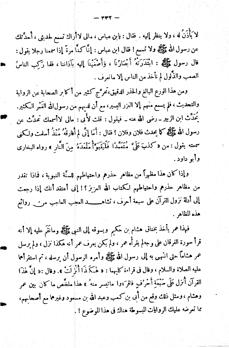وإذا كان هذا مظهرا من مظاهر حذرهم واحتياطهم للسنة النبوية فماذا تقدر من مظاهر حذرهم واحتياطهم لكتاب الله العزيز؟ إني أعتقد أنك إذا رجعت إلى أدلة نزول القرآن على سبعة أحرف تشاهد العجب العاجب من روائع هذه المظاهر.