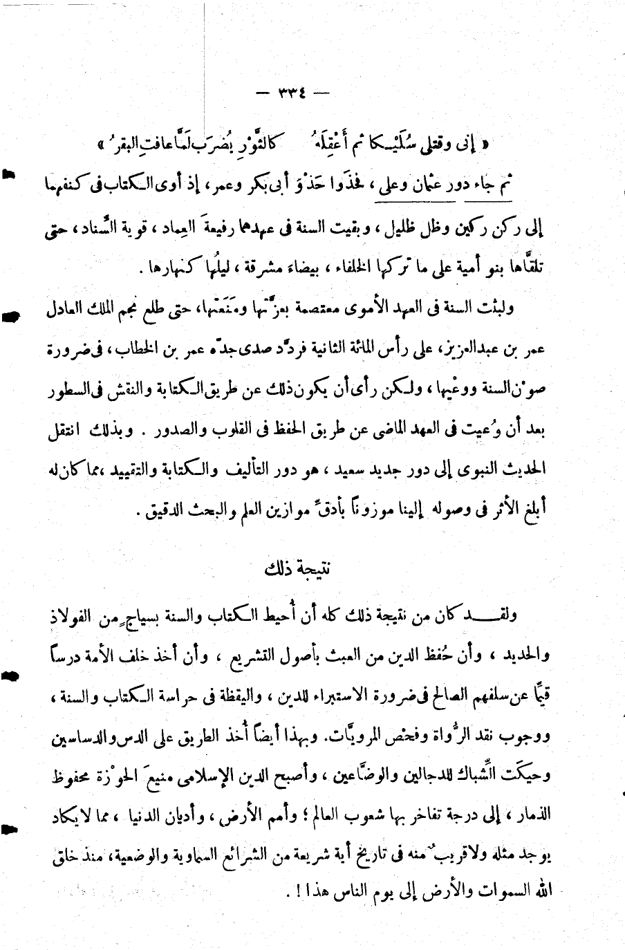 ثم جاء دور عثمان وعلي فحذوا حذو أبي بكر وعمر إذ أوى الكتاب في كنفهما إلى ركن ركين وظل ظليل وبقيت السنة في عهدهما رفيعة العماد قوية السناد حتى تلقاها بنو أمية على ما تركها الخلفاء بيضاء مشرقة ليلها كنهارها.