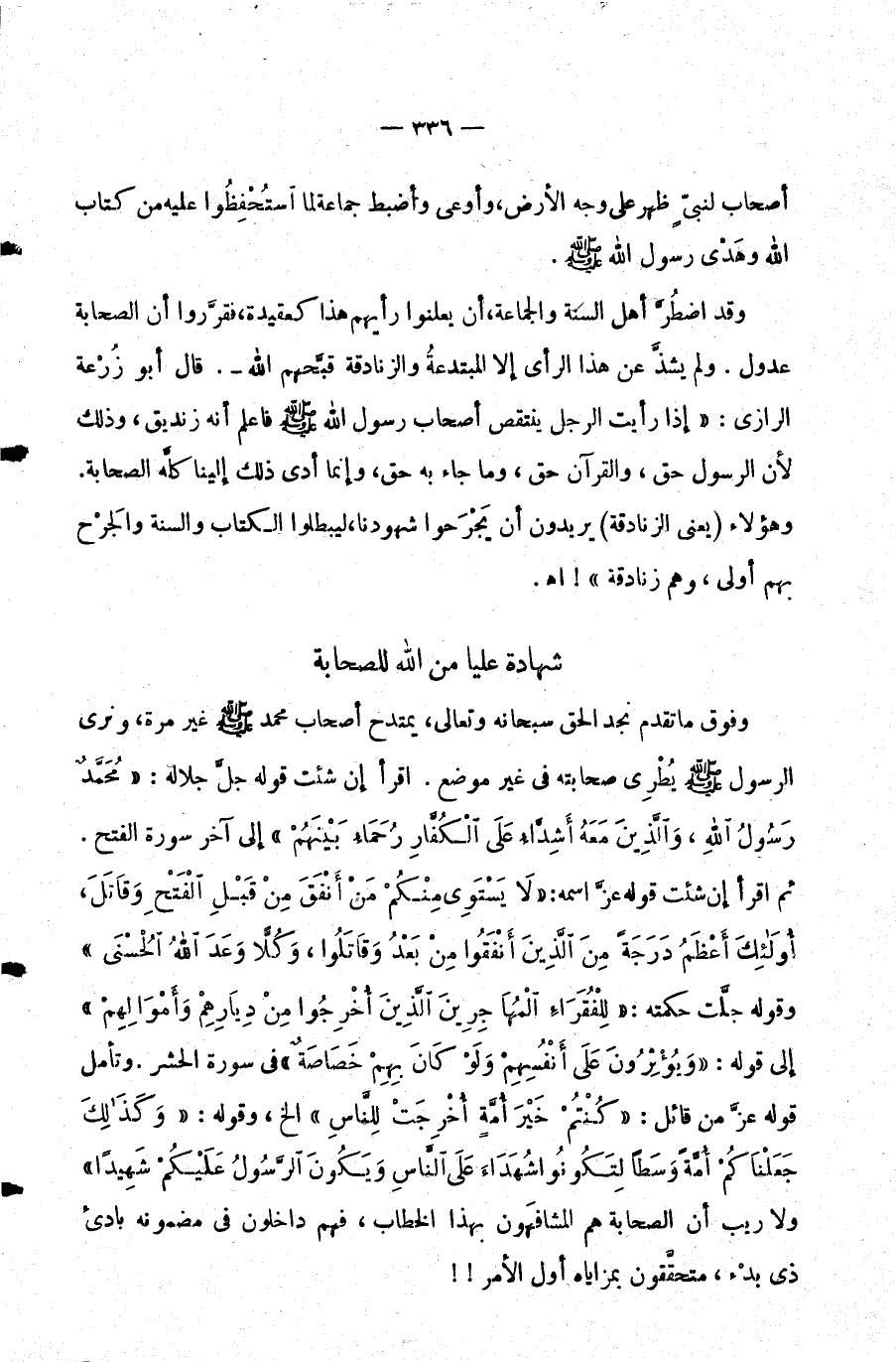وفوق ما تقدم نجد الحق سبحانه وتعالى يمتدح أصحاب محمد صلى الله عليه وسلم غير مرة ونرى الرسول صلى الله عليه وسلم يطري صحابته في غير موضع. اقرأ إن شئت قوله جل جلاله: {مُحَمَّدٌ رَسُولُ اللَّهِ وَالَّذِينَ مَعَهُ أَشِدَّاءُ عَلَى الْكُفَّارِ رُحَمَاءُ بَيْنَهُمْ} إلى آخر سورة الفتح. ثم اقرأ إن شئت قوله عز اسمه: {لا يَسْتَوِي مِنْكُمْ مَنْ أَنْفَقَ مِنْ قَبْلِ الْفَتْحِ وَقَاتَلَ أُولَئِكَ أَعْظَمُ دَرَجَةً مِنَ الَّذِينَ أَنْفَقُوا مِنْ بَعْدُ وَقَاتَلُوا وَكُلّاً وَعَدَ اللَّهُ الْحُسْنَى} وقوله جلت حكمته: {لِلْفُقَرَاءِ الْمُهَاجِرِينَ الَّذِينَ أُخْرِجُوا مِنْ دِيَارِهِمْ وَأَمْوَالِهِمْ} إلى قوله: {وَيُؤْثِرُونَ عَلَى أَنْفُسِهِمْ وَلَوْ كَانَ بِهِمْ خَصَاصَةٌ} في سورة الحشر. وتأمل قوله عز من قائل: {كُنْتُمْ خَيْرَ أُمَّةٍ أُخْرِجَتْ لِلنَّاسِ} الخ وقوله: {وَكَذَلِكَ جَعَلْنَاكُمْ أُمَّةً وَسَطاً لِتَكُونُوا شُهَدَاءَ عَلَى النَّاسِ وَيَكُونَ الرَّسُولُ عَلَيْكُمْ شَهِيداً} ولا ريب أن الصحابة هم المشافهون بهذا الخطاب فهم داخلون في مضمونة بادئ ذي بدء متحققون بمزاياه أول الأمر.