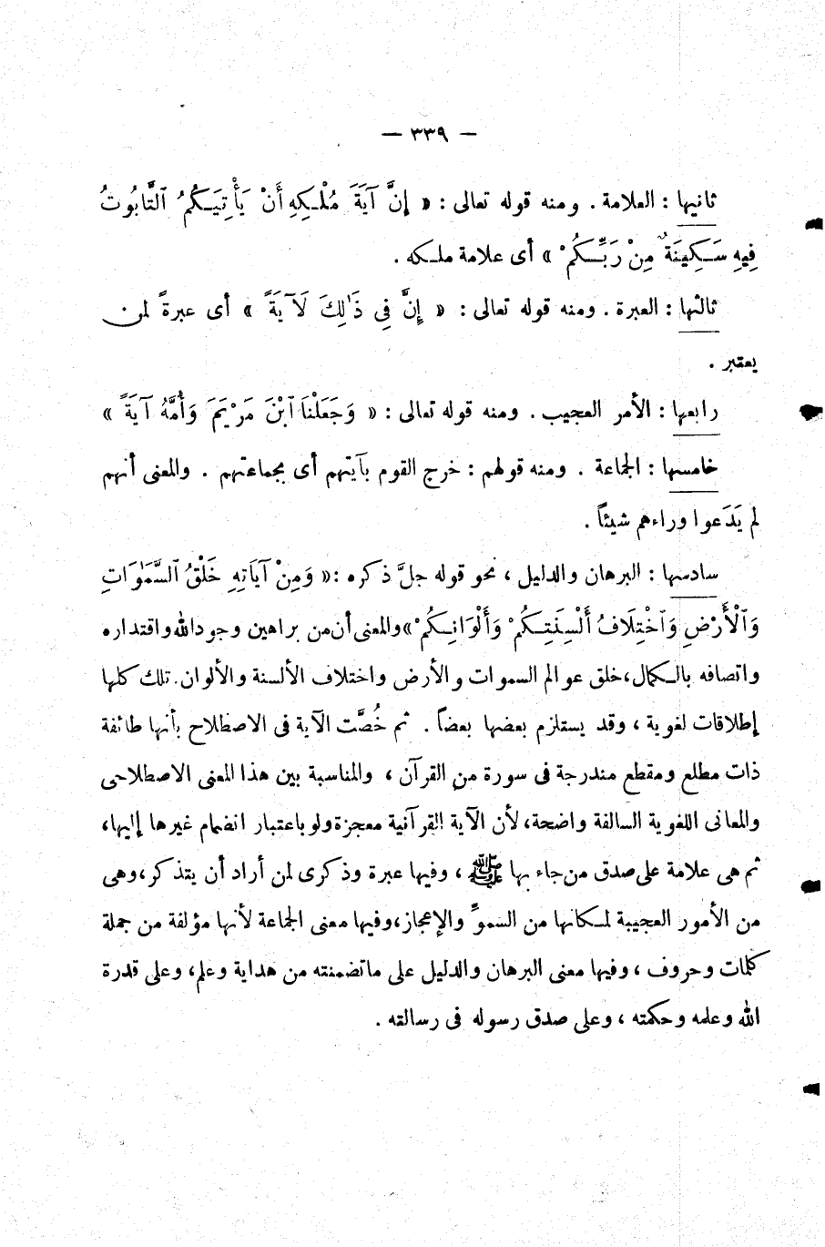 سادسها: البرهان والدليل نحو قوله جل ذكره: {وَمِنْ آيَاتِهِ خَلْقُ السَّمَاوَاتِ وَالْأَرْضِ وَاخْتِلافُ أَلْسِنَتِكُمْ وَأَلْوَانِكُمْ} والمعنى أن من براهين وجود الله واقتداره واتصافه بالكمال خلق عوالم السموات والأرض واختلاف الألسنة والألوان تلك كلها إطلاقات لغوية وقد يستلزم بعضها بعضا. ثم خصت الآية في الاصطلاح بأنها طائفة ذات مطلع ومقطع مندرجة في سورة من القرآن والمناسبة بين هذا المعنى الاصطلاحي والمعاني اللغوية السالفة واضحة لأن الآية القرآنية معجزة ولو باعتبار انضمام غيرها إليها ثم هي علامة على صدق من جاء بها صلى الله عليه وسلم وفيها عبرة وذكرى لمن أراد أن يتذكر وهي من الأمور العجيبة لمكانها من السمو والإعجاز وفيها معنى الجماعة لأنها مؤلفة من جملة كلمات وحروف وفيها معنى البرهان والدليل على ما تضمنته من هداية وعلم وعلى قدرة الله وعلمه وحكمته وعلى صدق رسوله في رسالته.