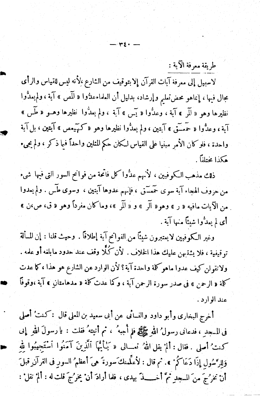 لا سبيل إلى معرفة آيات القرآن إلا بتوقيف من الشارع لأنه ليس للقياس والرأي مجال فيها إنما هو محض تعليم وإرشاد بدليل أن العلماء عدوا {المص} آية ولم يعدوا نظيرها وهو {المر} آية وعدوا {يس} آية ولم يعدوا نظيرها وهو {طس} آية وعدوا {حم عسق} آيتين ولم يعدوا نظيرها وهو {كهيعص} آيتين بل آية واحدة فلو كان الأمر مبنيا على القياس لكان حكم المثلين واحدا فيما ذكر ولم يجيء هكذا مختلفا.