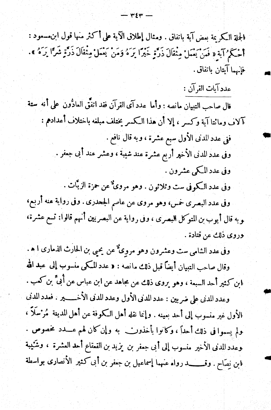 قال صاحب التبيان ما نصه: وأما عدد آي القرآن فقد اتفق العادون على أنه ستة آلاف ومائتا آية وكسر إلا أن هذا الكسر يختلف مبلغه باختلاف أعدادهم: