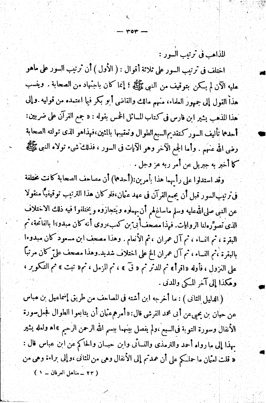 اختلف في ترتيب السور على ثلاثة أقوال: الأول أن ترتيب السور على ما هو عليه الآن لم يكن بتوقيف من النبي صلى الله عليه وسلم إنما كان باجتهاد من الصحابة. وينسب هذا القول إلى جمهور العلماء منهم مالك والقاضي أبو بكر فيما اعتمده من قوليه. وإلى هذا المذهب يشير ابن فارس في كتاب المسائل الخمس بقوله: جمع القرآن على ضربين: أحدهما تأليف السور كتقديم السبع الطوال وتعقيبها بالمئين فهذا هو الذي تولته الصحابة رضي الله عنهم. وأما الجمع الآخر وهو الآيات في السور فذلك شيء تولاه النبي صلى الله عليه وسلم كما أخبر به جبريل عن أمر ربه عز وجل.