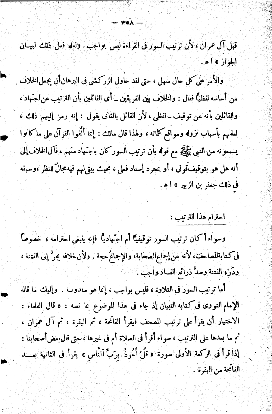 والأمر على كل حال سهل حتى لقد حاول الزركشي في البرهان أن يجعل الخلاف من أساسه لفظيا فقال: والخلاف بين الفريقين أي القائلين بأن الترتيب عن اجتهاد والقائلين بأنه عن توقيف لفظي لأن القائل بالثاني يقول: إنه رمز إليهم ذلك لعلمهم بأسباب نزوله ومواقع كلماته ولهذا قال مالك: إنما ألفوا القرآن على ما كانوا يسمعونه من النبي صلى الله عليه وسلم مع قوله بأن ترتيب السور كان باجتهاد منهم فآل الخلاف إلى أنه هل هو بتوقيف قولي أو بمجرد إسناد فعلي بحيث يبقى لهم فيه مجال للنظر وسبقه في ذلك جعفر بن الزبير اهـ.