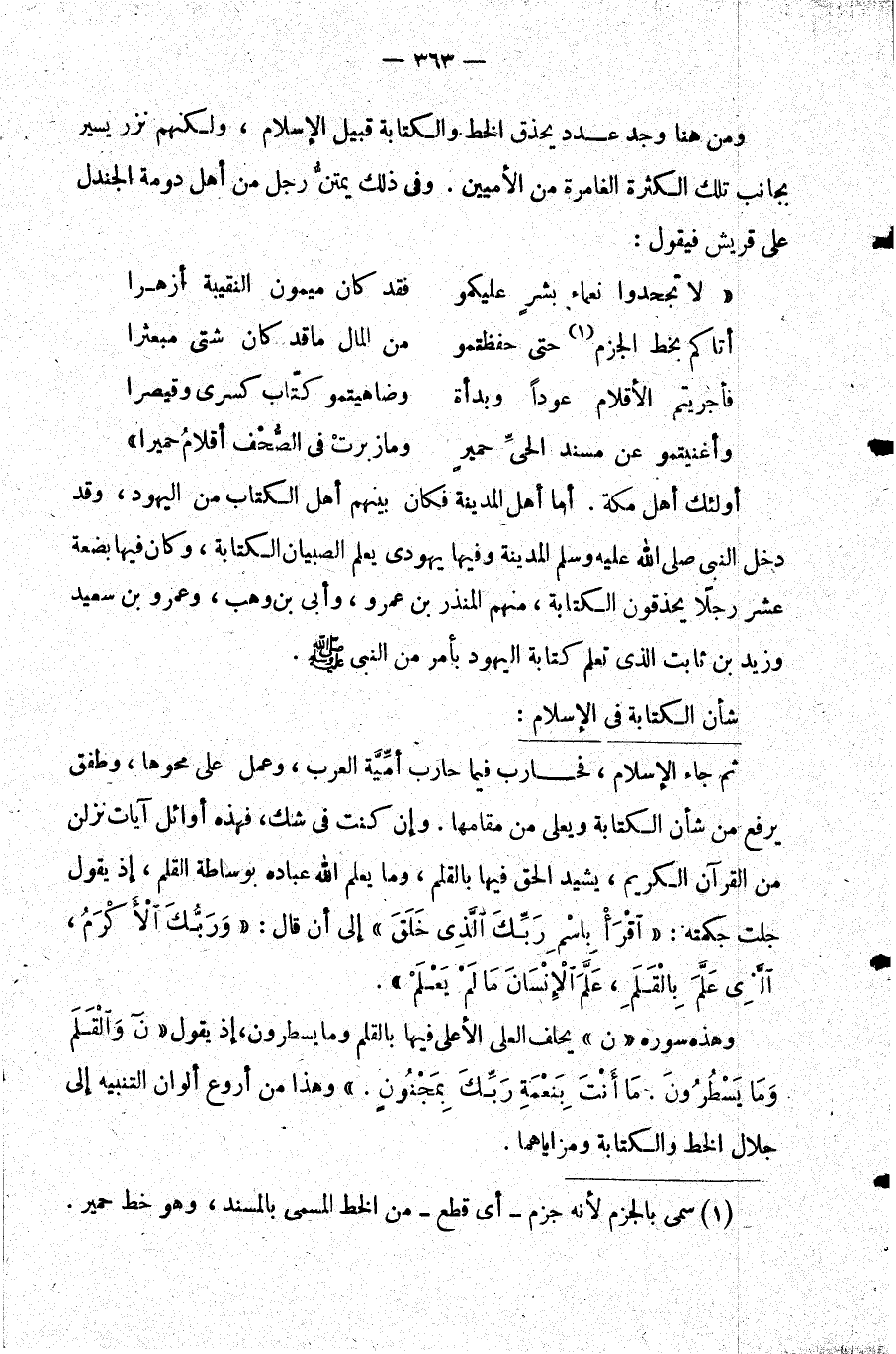ثم جاء الإسلام فحارب فيما حارب أمية العرب وعمل على محوها وطفق يرفع من شأن الكتابة ويعلي من مقامها. وإن كنت في شك فهذه أوائل آيات نزلن من القرآن الكريم يشيد الحق فيها بالقلم وما يعلم الله عباده بوساطة القلم إذ يقول جلت حكمته: {اقْرَأْ بِاسْمِ رَبِّكَ الَّذِي خَلَقَ} إلى أن قال: {وَرَبُّكَ الْأَكْرَمُ, الَّذِي عَلَّمَ بِالْقَلَمِ, عَلَّمَ الْأِنْسَانَ مَا لَمْ يَعْلَمْ} .