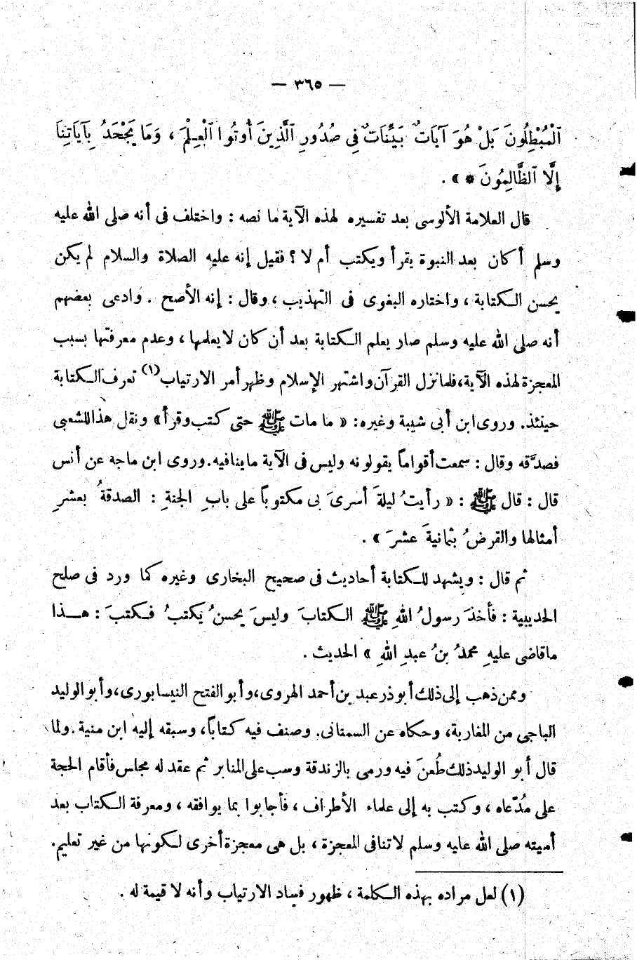 وممن ذهب إلى ذلك أبو ذر عبد بن أحمد الهروي وأبو الفتح النيسابوري وأبو الوليد الباجي من المغاربة وحكاه عن السمناني. وصنف فيه كتابا وسبقه إليه ابن منية. ولما قال أبو الوليد ذلك طعن فيه ورمي بالزندقة وسب على المنابر ثم عقد له مجلس فأقام الحجة على مدعاه وكتب به إلى علماء الأطراف فأجابوا بما يوافقه ومعرفة الكتاب بعد أميته صلى الله عليه وسلم لا تنافي المعجزة بل هي معجزة أخرى لكونها من غير تعليم.