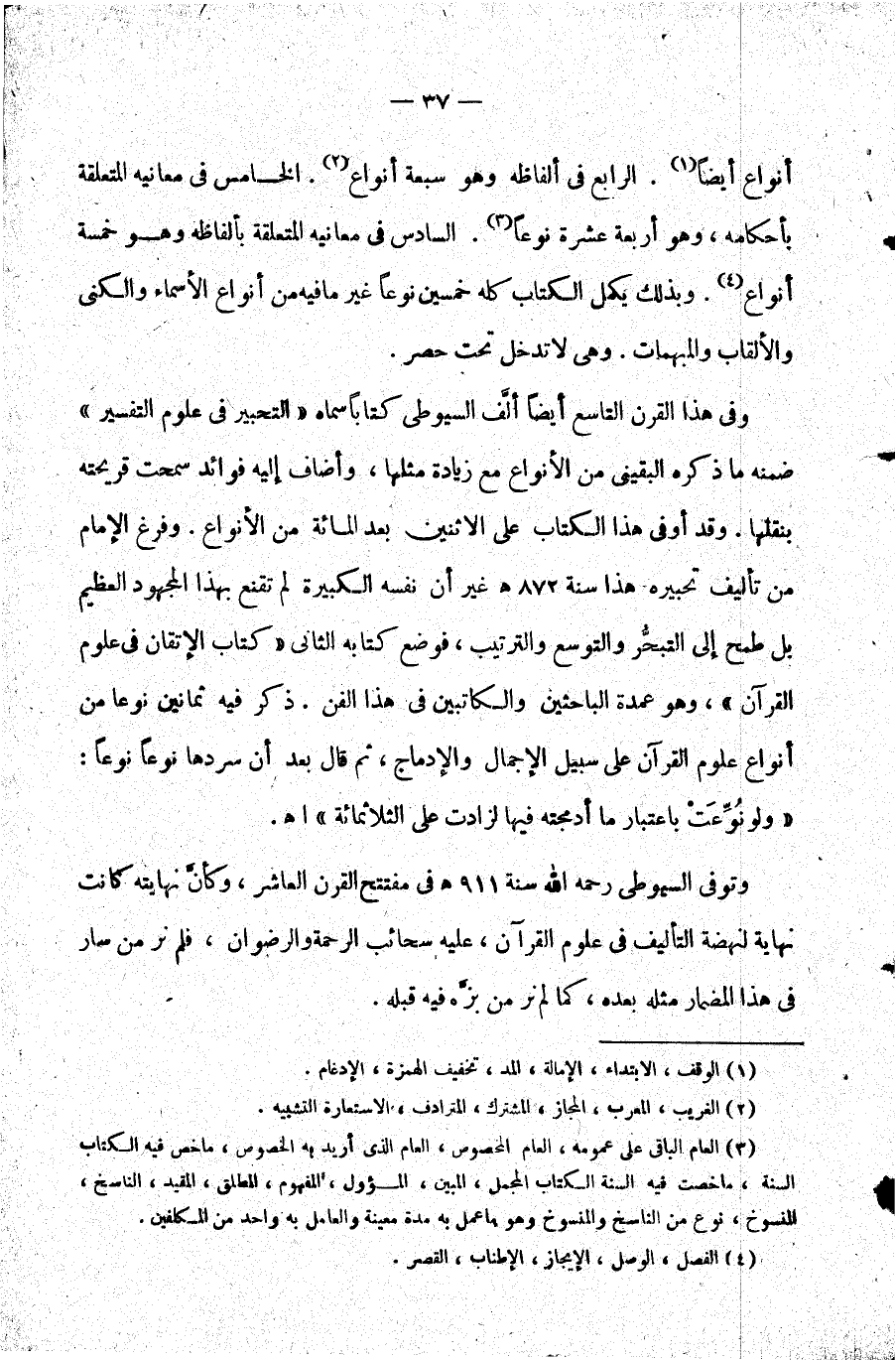 وفي هذا القرن التاسع أيضا ألف السيوطي كتابا سماه التحبير في علوم التفسير ضمنه ما ذكره البلقيني من الأنواع مع زيادة مثلها وأضاف إليه فوائد سمحت قريحته بنقلها. وقد أوفى هذا الكتاب على الاثنين بعد المائة من الأنواع. وفرغ الإمام من تأليف تحبيره هذا سنة 872 هـ غير أن نفسه الكبيرة لم تقنع بهذا المجهود العظيم بل طمح إلى التبحر والتوسع والترتيب فوضع كتابه الثاني كتاب الإتقان في علوم القرآن وهو عمدة الباحثين والكاتبين في هذا الفن. ذكر فيه ثمانين نوعا من أنواع علوم القرآن على سبيل الإجمال والإدماج ثم قال بعد أن سردها نوعا نوعا ولو نوعت باعتبار ما أدمجته فيها لزادت على الثلاثمائة اهـ.