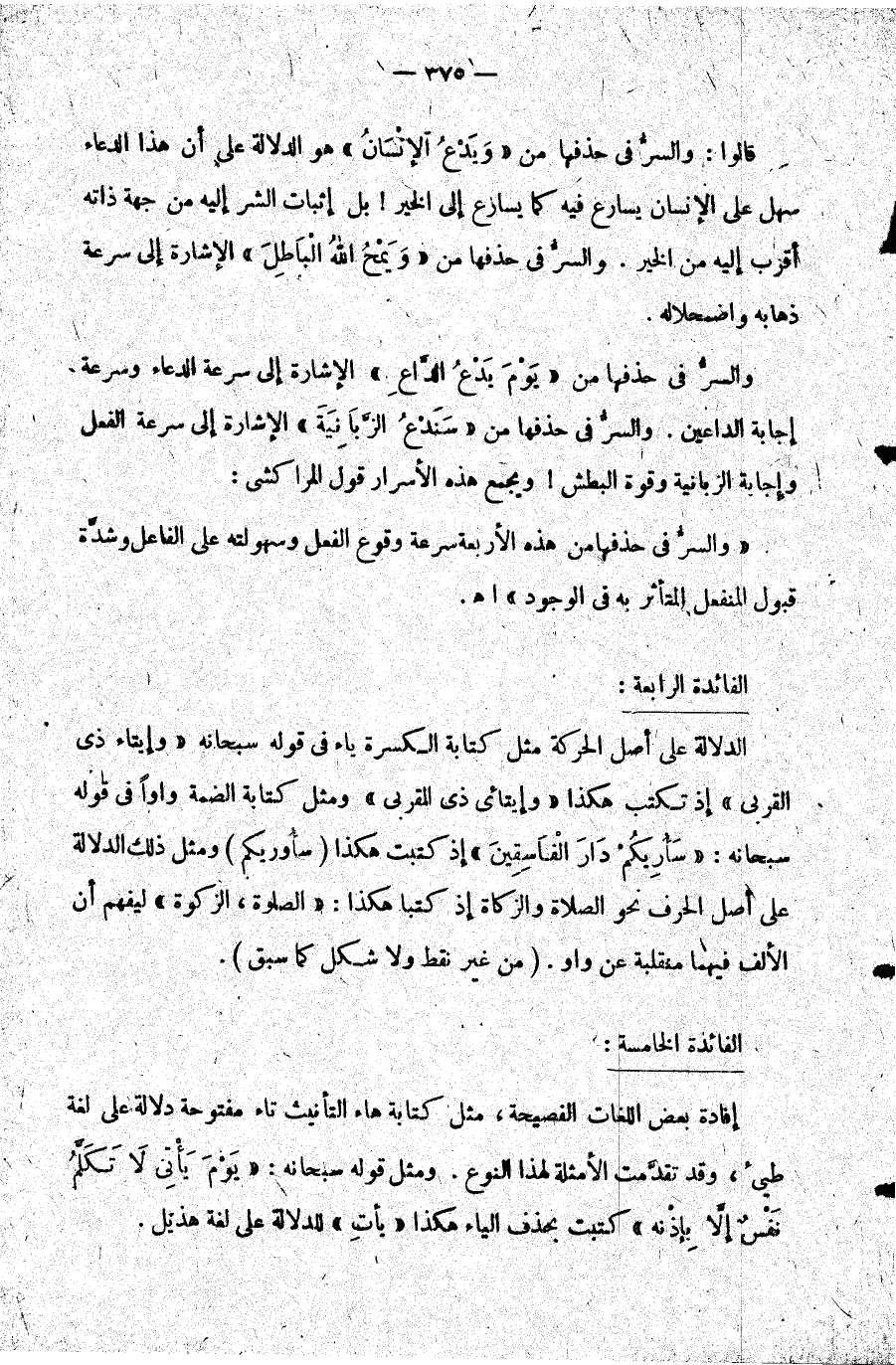 الدلالة على أصل الحركة مثل كتابة الكسرة ياء في قوله سبحانه {وَإِيتَاءِ ذِي الْقُرْبَى} إذ تكتب هكذا وإيتاءى ذي القربى ومثل كتابة الضمة واوا في قوله سبحانه: {سَأُرِيكُمْ دَارَ الْفَاسِقِينَ} إذ كتبت هكذا سأوريكم ومثل ذلك الدلالة على أصل الحرف نحو الصلاة والزكاة إذ كتبا هكذا: الصلوة الزكوة ليفهم أن الألف فيهما منقلبة عن واو. من غير نقط ولا شكل كما سبق.