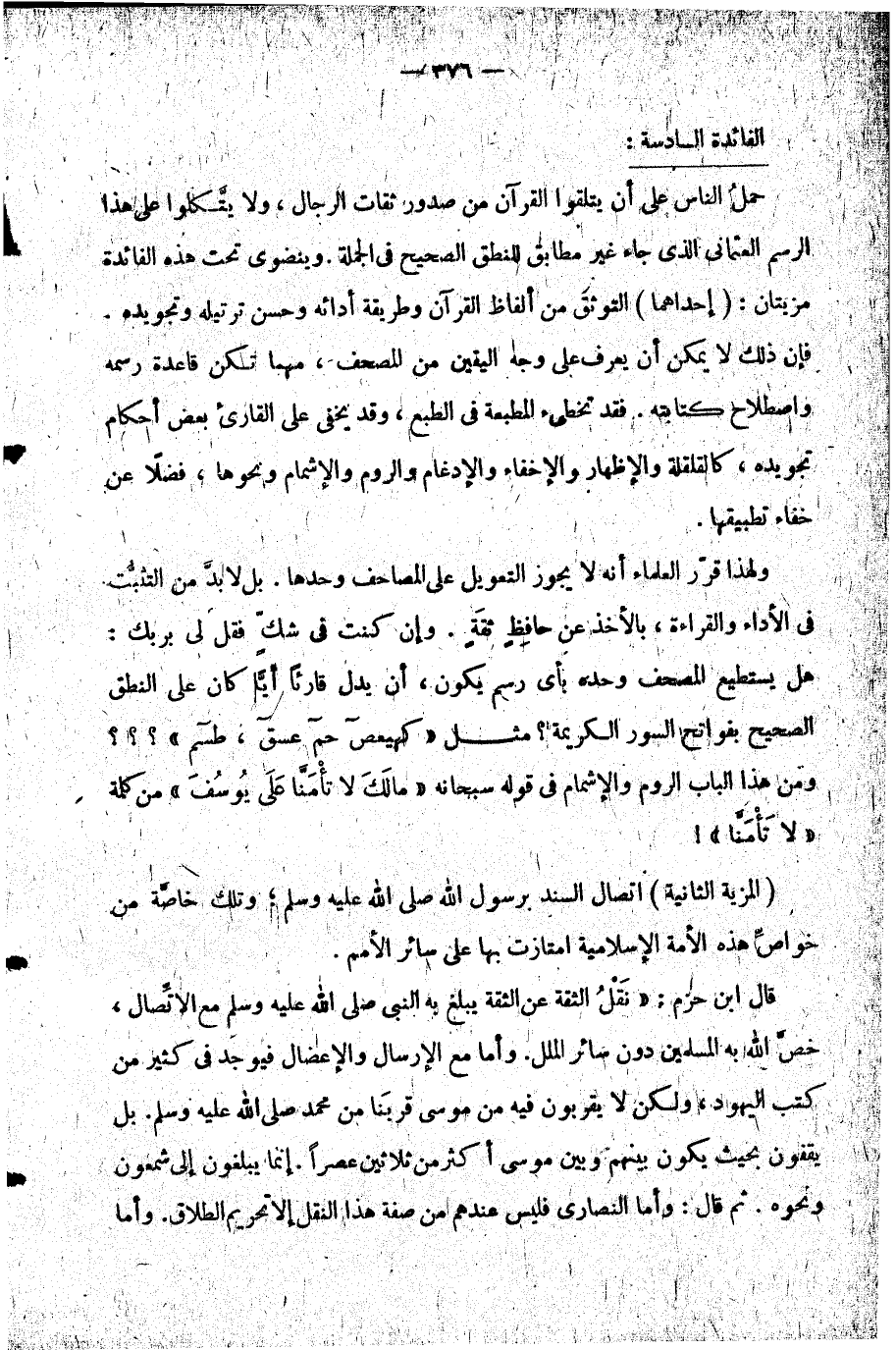 حمل الناس على أن يتلقوا القرآن من صدور ثقات الرجال ولا يتكلوا على هذا الرسم العثماني الذي جاء غير مطابق للنطق الصحيح في الجملة. وينضوي تحت هذه الفائدة مزيتان إحداهما التوثق من ألفاظ القرآن وطريقة أدائه وحسن ترتيله وتجويده. فإن ذلك لا يمكن أن يعرف على وجه اليقين من المصحف مهما تكن قاعدة رسمه واصطلاح كتابته. فقد تخطئ المطبعة في الطبع وقد يخفى على القارئ بعض أحكام تجويده كالقلقلة والإظهار والإخفاء والإدغام والروم والإشمام ونحوها فضلا عن خفاء تطبيقها.