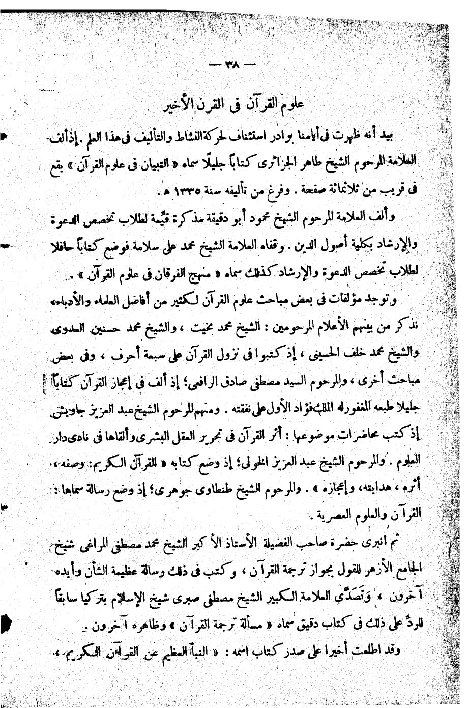 ثم انبرى حضرة صاحب الفضيلة الأستاذ الأكبر الشيخ محمد مصطفى المراغي شيخ الجامع الأزهر للقول بجواز ترجمة القرآن وكتب في ذلك رسالة عظيمة الشأن وأيده آخرون وتصدى العلامة الكبير الشيخ مصطفى صبري شيخ الإسلام بتركيا سابقا للرد على ذلك في كتاب دقيق سماه مسألة ترجمة القرآن وظاهره آخرون.
