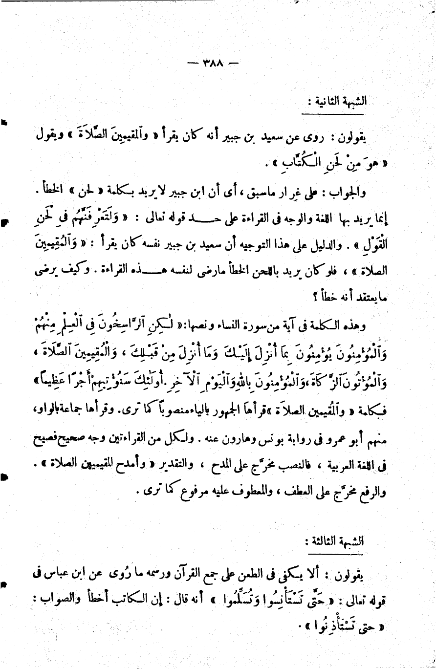 والجواب: على غرار ما سبق أي أن ابن جبير لا يريد بكلمة لحن الخطأ. إنما يريد بها اللغة والوجه في القراءة على حد قوله تعالى: {وَلَتَعْرِفَنَّهُمْ فِي لَحْنِ الْقَوْلِ} . والدليل على هذا التوجيه أن سعيد بن جبير نفسه كان يقرأ: {وَالْمُقِيمِينَ الصَّلاةَ} فلو كان يريد باللحن الخطأ ما رضي لنفسه هذه القراءة. وكيف يرضى ما يعتقد أنه خطأ؟