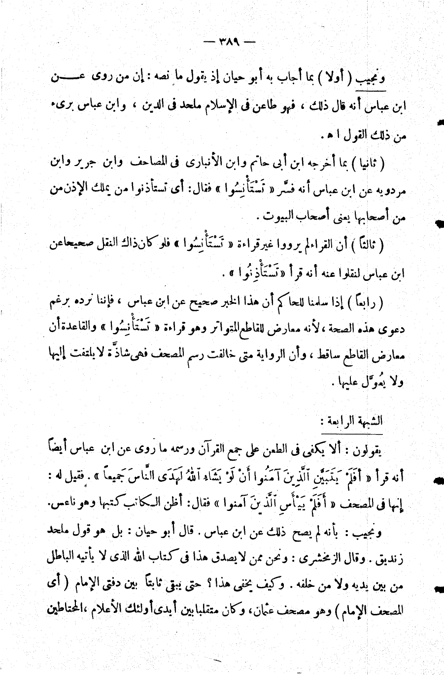 رابعا: إذا سلمنا للحاكم أن هذا الخبر صحيح عن ابن عباس فإننا نرده برغم دعوى هذه الصحة لأنه معارض للقاطع المتواتر وهو قراءة {تَسْتَأْنِسُوا} والقاعدة أن معارض القاطع ساقط وأن الرواية متى خالفت رسم المصحف فهي شاذة لا يلتفت إليها ولا يعول عليها.