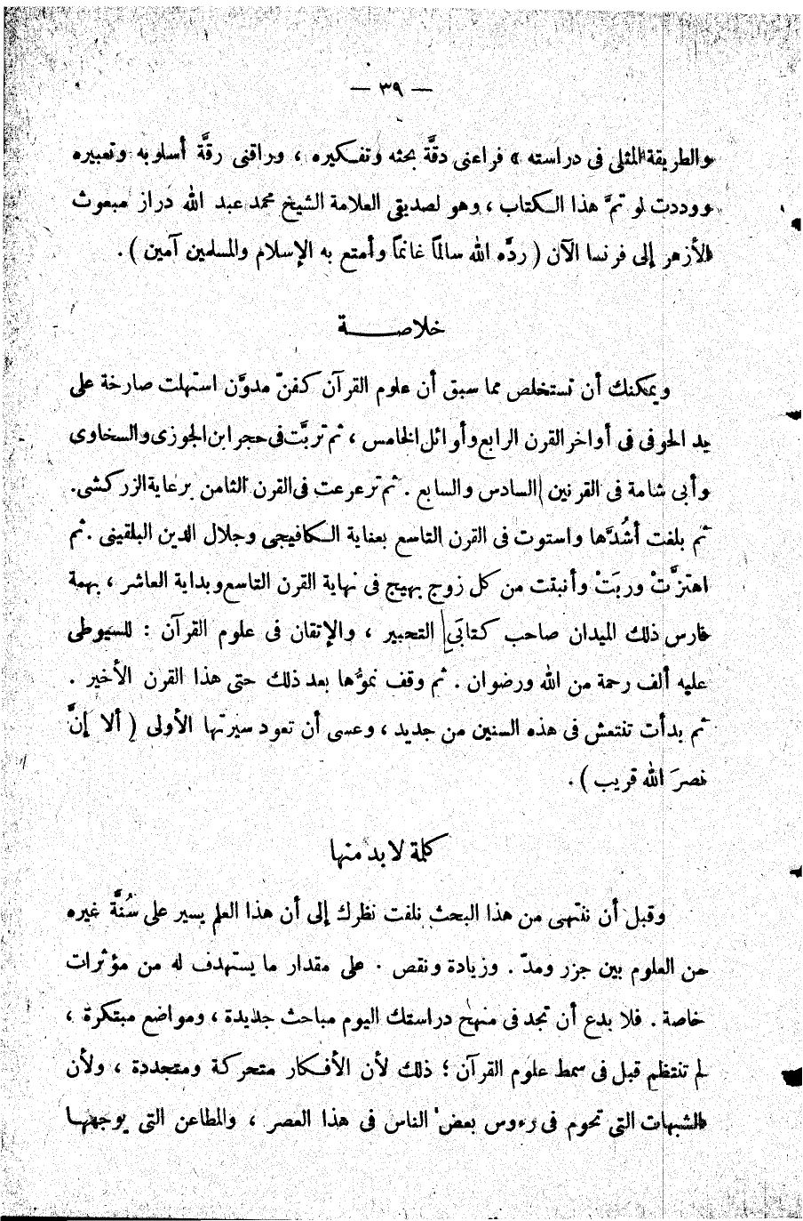 والطريقة المثلى في دراسته فراعني دقة بحثه وتفكيره وراقني رقة أسلوبه وتعبيره ووددت لو تم هذا الكتاب وهو لصديقي العلامة الشيخ محمد عبد الله دراز مبعوث الأزهر إلى فرنسا الآن رده الله سالما غانما وأمتع به الإسلام والمسلمين آمين.