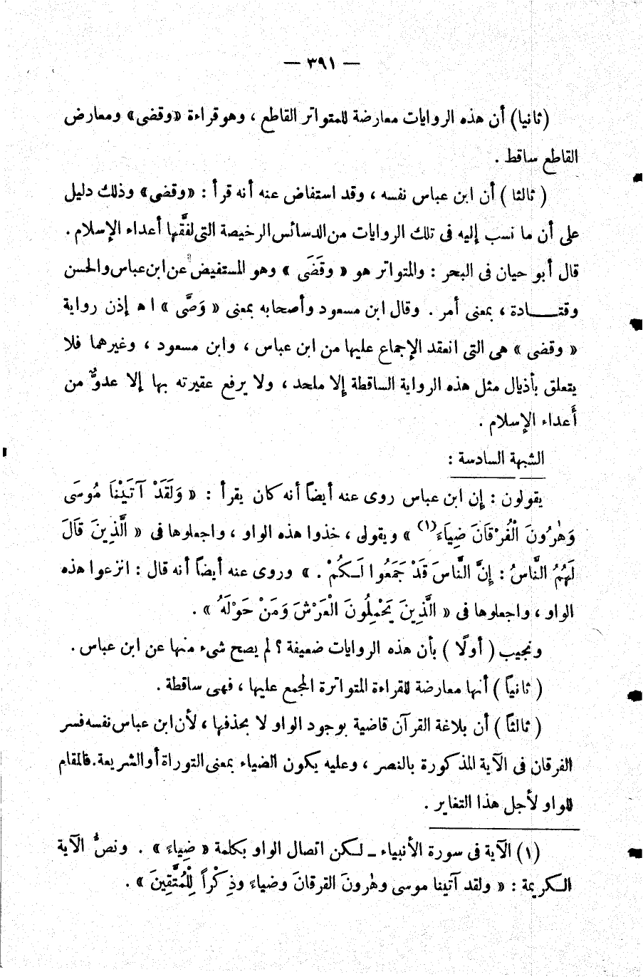 ثالثا: أن بلاغة القرآن قاضية بوجود الواو لا بحذفها لأن ابن عباس نفسه فسر الفرقان في الآية المذكورة بالنصر وعليه يكون الضياء بمعنى التوراة أو الشريعة. فالمقام للواو لأجل هذا التغاير.