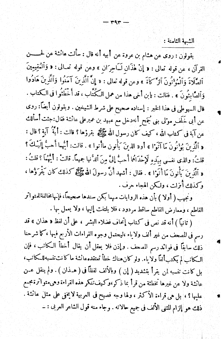ثانيا: أنه قد نص في كتاب إتحاف فضلاء البشر على أن لفظ هذان قد رسم في المصحف من غير ألف ولا ياء ليحتمل وجوه القراءات الأربع فيها كما شرحنا ذلك سابقا في فوائد رسم المصحف. وإذن فلا يعقل أن يقال أخطأ الكاتب فإن الكاتب لم يكتب ألفا ولا ياء. ولو كان هناك خطأ تعتقده عائشة ما كانت تنسبه للكاتب بل كانت تنسبه لمن يقرأ بتشديد إن وبالألف لفظا في هذان. ولم ينقل عن عائشة ولا عن غيرها تخطئة من قرأ بما ذكر وكيف تنكر هذه القراءة وهي متواترة مجمع عليها؟ بل هي قراءة الأكثر ولها وجه فصيح في العربية لا يخفى على مثل عائشة. ذلك هو إلزام المثنى الألف في جميع حالاته. وجاء منه قول الشاعر العربي:-