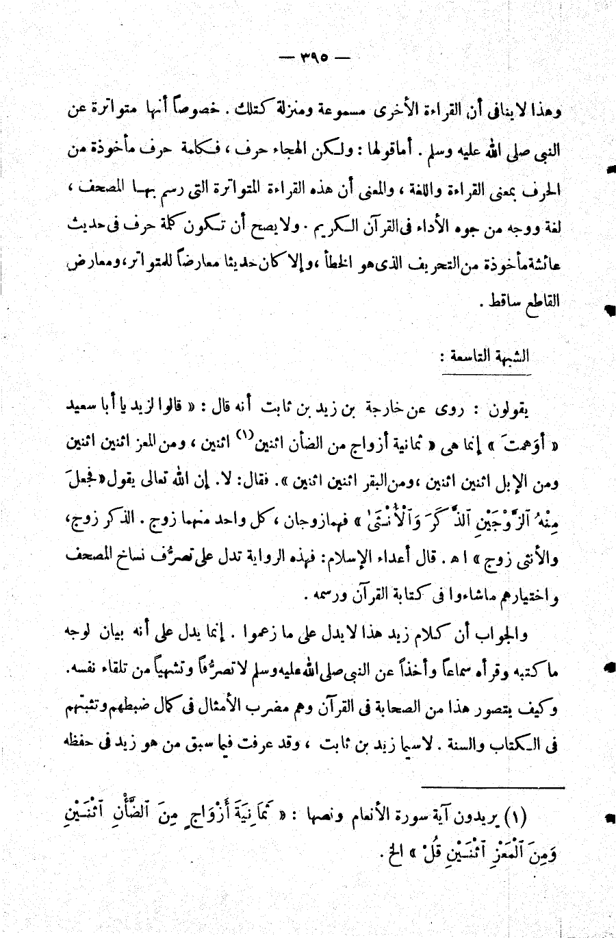 يقولون: روي عن خارجة بن زيد بن ثابت أنه قال: قالوا لزيد يا أبا سعيد أوهمت إنما هي ثمانية أزواج من الضأن اثنين1 اثنين ومن المعز اثنين اثنين ومن الإبل اثنين اثنين ومن البقر اثنين اثنين. فقال: لا. إن الله تعالى يقول: {فَجَعَلَ مِنْهُ الزَّوْجَيْنِ الذَّكَرَ وَالْأُنْثَى} فهما زوجان كل واحد منهما زوج. الذكر زوج والأنثى زوج اهـ. قال أعداء الإسلام: فهذه الرواية تدل على تصرف نساخ المصحف واختيارهم ما شاءوا في كتابة القرآن ورسمه.