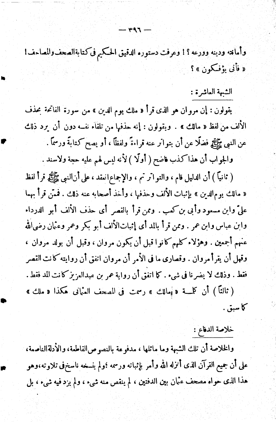 ثانيا أن الدليل قام والتواتر تم والإجماع انعقد على أن النبي صلى الله عليه وسلم قرأ لفظ مالك يوم الدين بإثبات الألف وحذفها وأخذ أصحابه عنه ذلك. فممن قرأ بهما علي وابن مسعود وأبي بن كعب. وممن قرأ بالقصر أي حذف الألف أبو الدرداء وابن عباس وابن عمر. وممن قرأ بالمد أي إثبات الألف أبو بكر وعمر وعثمان رضي الله عنهم أجمعين. وهؤلاء كلهم كانوا قبل أن يكون مروان وقبل أن يولد مروان وقبل أن يقرأ مروان. وقصارى ما في الأمر أن مروان اتفق أن روايته كانت القصر فقط. وذلك لا يضرنا في شيء. كما اتفق أن رواية عمر بن عبد العزيز كانت المد فقط.