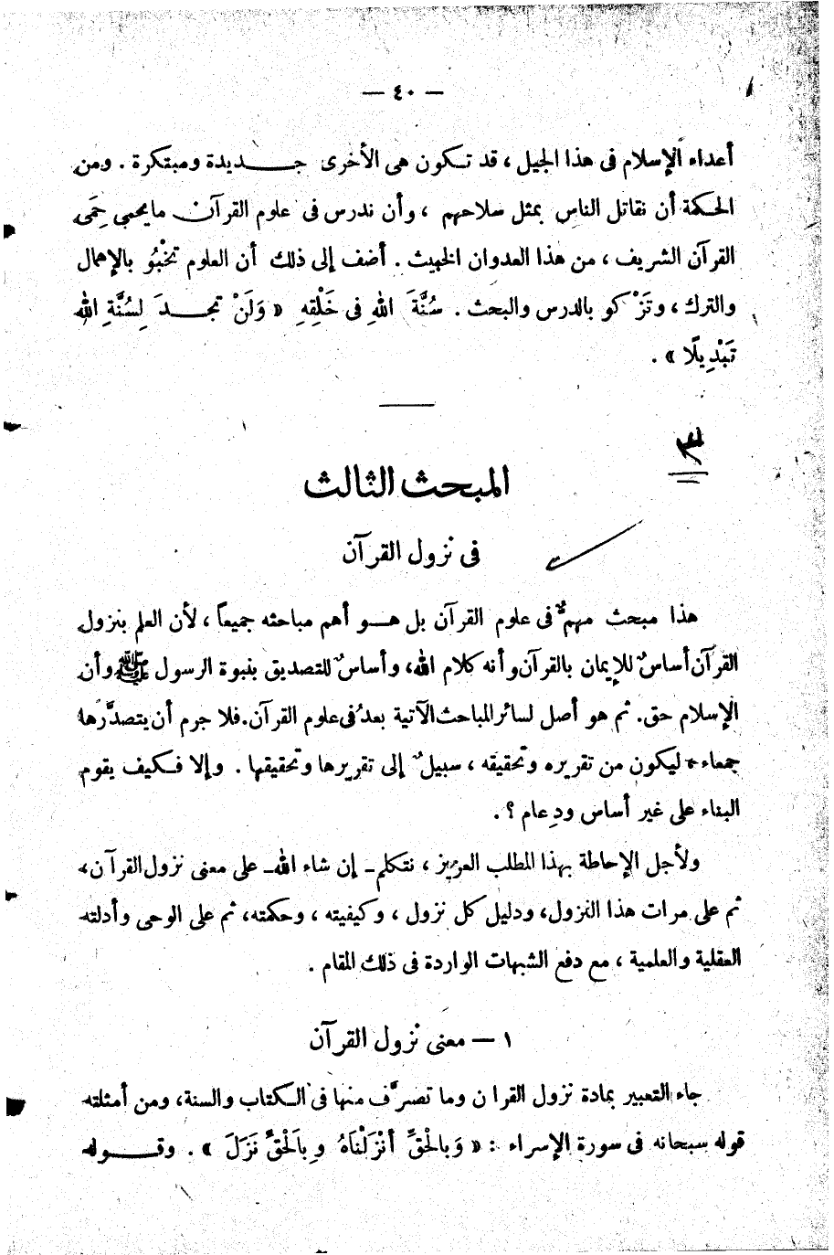 أعداء الإسلام في هذا الجيل, قد تكون هي الأخرى جديدة ومبتكرة. ومن الحكمة أن نقاتل الناس بمثل سلاحهم وأن ندرس في علوم القرآن ما يحمي حمى القرآن الشريف من هذا العدوان الخبيث. أضف إلى ذلك أن العلوم تخبو بالإهمال والترك وتزكو بالدرس والبحث. سنة الله في خلقه {وَلَنْ تَجِدَ لِسُنَّةِ اللَّهِ تَبْدِيلاً} .