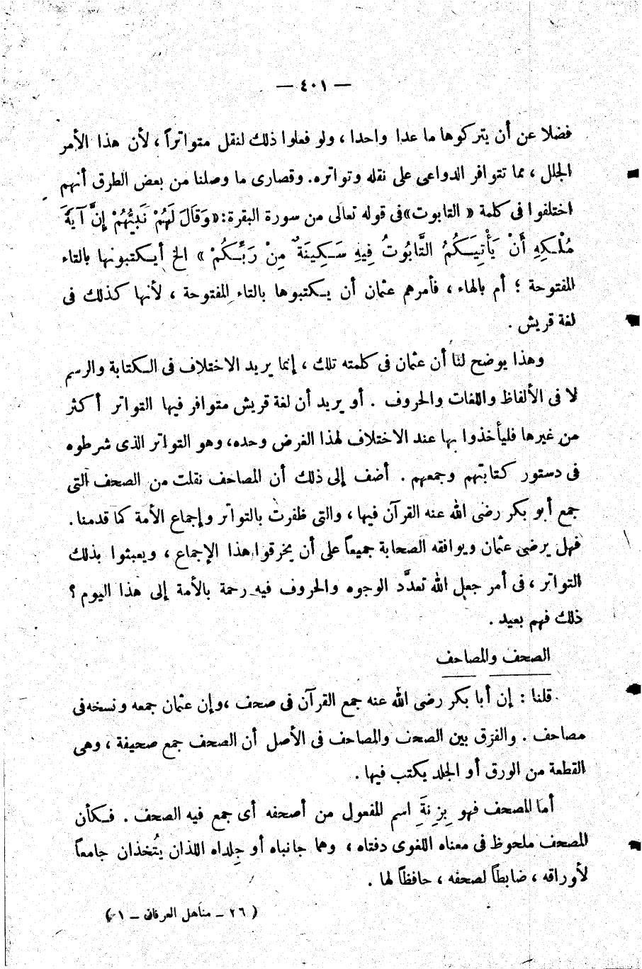 وهذا يوضح لنا أن عثمان في كلمته تلك إنما يريد الاختلاف في الكتابة والرسم لا في الألفاظ واللغات والحروف. أو يريد أن لغة قريش متوافر فيها التواتر أكثر من غيرها فليأخذوا بها عند الاختلاف لهذا الغرض وحده وهو التواتر الذي شرطوه في دستور كتابتهم وجمعهم. أضف إلى ذلك أن المصاحف نقلت من الصحف التي جمع أبو بكر رضي الله عنه القرآن فيها والتي ظفرت بالتواتر وإجماع الأمة كما قدمنا. فهل يرضى عثمان ويوافقه الصحابة جميعا على أن يخرقوا هذا الإجماع ويعبثوا بذلك التواتر في أمر جعل الله تعدد الوجوه والحروف فيه رحمة بالأمة إلى هذا اليوم؟ ذلك فهم بعيد.
