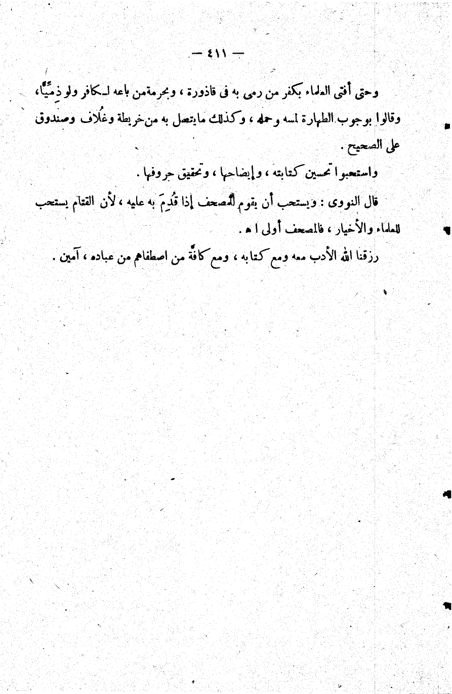 وحتى أفتى العلماء بكفر من رمى به في قاذورة وبحرمة من باعه لكافر ولو ذميا وقالوا بوجوب الطهارة لمسه وحمله وكذلك ما يتصل به من خريطة وغلاف وصندوق على الصحيح.
