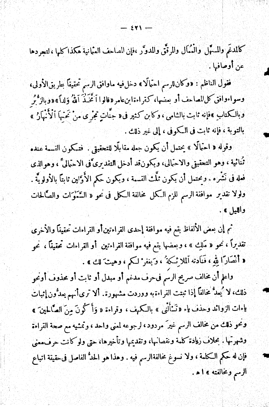 واعلم أن مخالف صريح الرسم في حرف مدغم أو مبدل أو ثابت أو محذوف أو نحو ذلك لا يعد مخالفا إذا ثبتت القراءة به ووردت مشهورة. ألا ترى أنهم يعدون إثبات ياءات الزوائد وحذف ياء {تَسْأَلْنِي} بالكهف وقراءة وأكون من الصالحين ونحو ذلك من مخالف الرسم غير مردود لرجوعه لمعنى واحد وتمشيه مع صحة القراءة وشهرتها. بخلاف زيادة كلمة ونقصانها وتقديمها وتأخيرها حتى ولو كانت حرف معنى فإن له حكم الكلمة ولا نسوغ مخالفة الرسم فيه. وهذا هو الحد الفاصل في حقيقة اتباع الرسم ومخالفته اهـ.