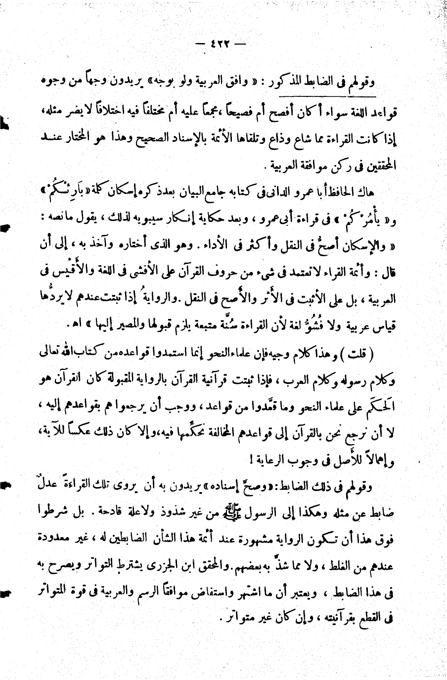 هاك الحافظ أبا عمرو الداني في كتابه جامع البيان بعد ذكره إسكان كلمة {بَارِئْكُمْ} و {يَأمُرْكُمْ} في قراءة أبي عمرو وبعد حكاية إنكار سيبويه لذلك يقول ما نصه: والإسكان أصح في النقل وأكثر في الأداء. وهو الذي أختاره وآخذ به إلى أن قال: وأئمة القراء لا تعتمد في شيء من حروف القرآن على الأفشى في اللغة والأقيس في العربية بل على الأثبت في الأثر والأصح في النقل. والرواية إذا ثبتت عندهم لا يردها قياس عربية ولا فشو لغة لأن القراءة سنة متبعة يلزم قبولها والمصير إليها ا. هـ.