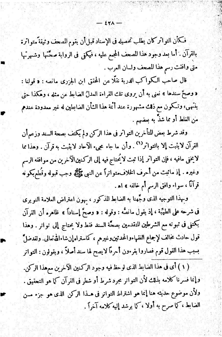 فكأن التواتر كان يطلب تحصيله في الإسناد قبل أن يقوم المصحف وثيقة متواترة بالقرآن. أما بعد وجود هذا المصحف المجمع عليه فيكفي في الرواية صحتها وشهرتها ما وافقت رسم هذا المصحف ولسان العرب.