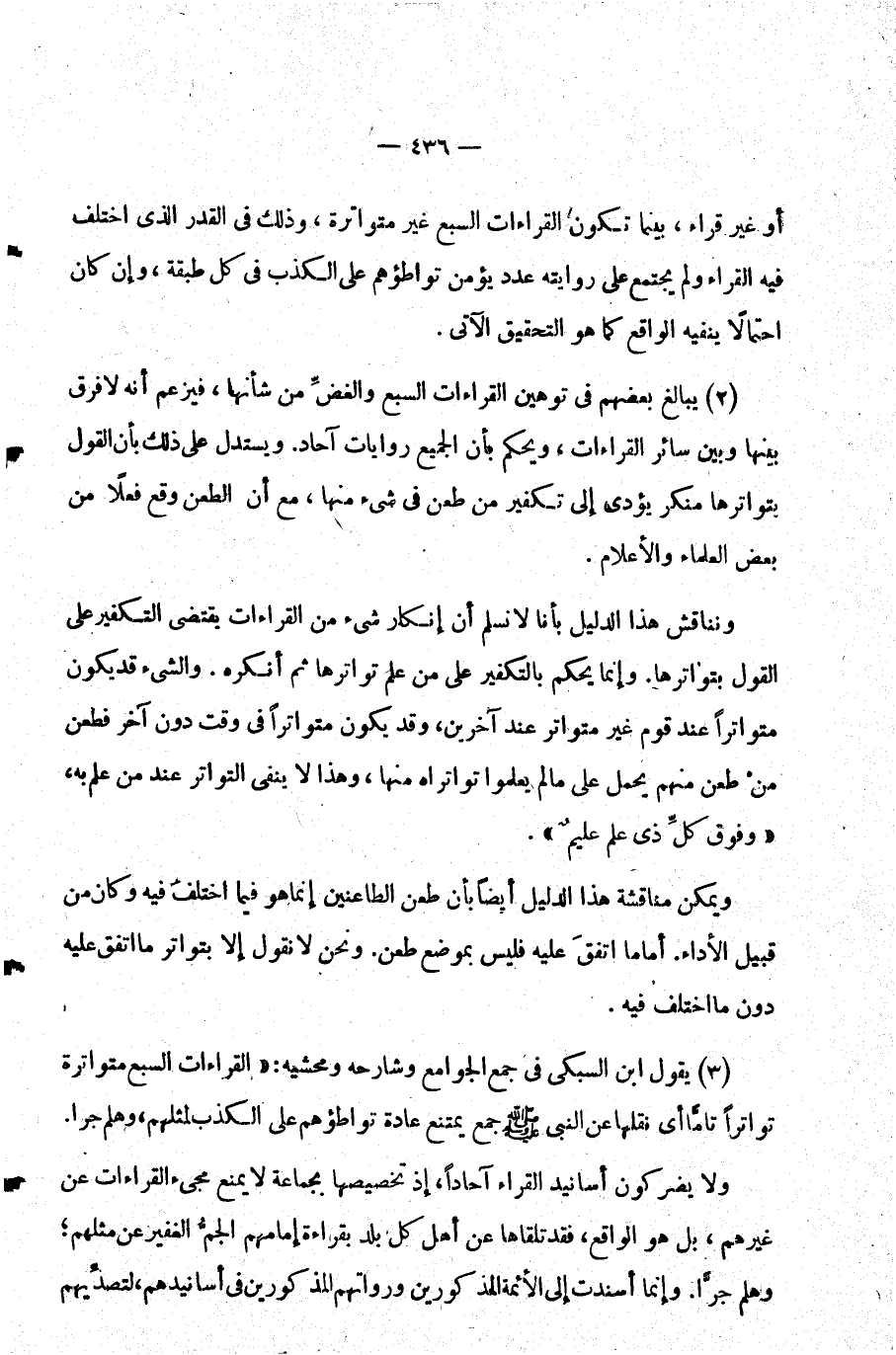 ونناقش هذا الدليل بأنا لا نسلم أن إنكار شيء من القراءات يقتضي التكفير على القول بتواترها. وإنما يحكم بالتكفير على من علم تواترها ثم أنكره. والشيء قد يكون متواترا عند قوم غير متواتر عند آخرين وقد يكون متواترا في وقت دون آخر فطعن من طعن منهم يحمل على ما لم يعلموا تواتره منها وهذا لا ينفي التواتر عند من علم به {وَفَوْقَ كُلِّ ذِي عِلْمٍ عَلِيمٌ} .