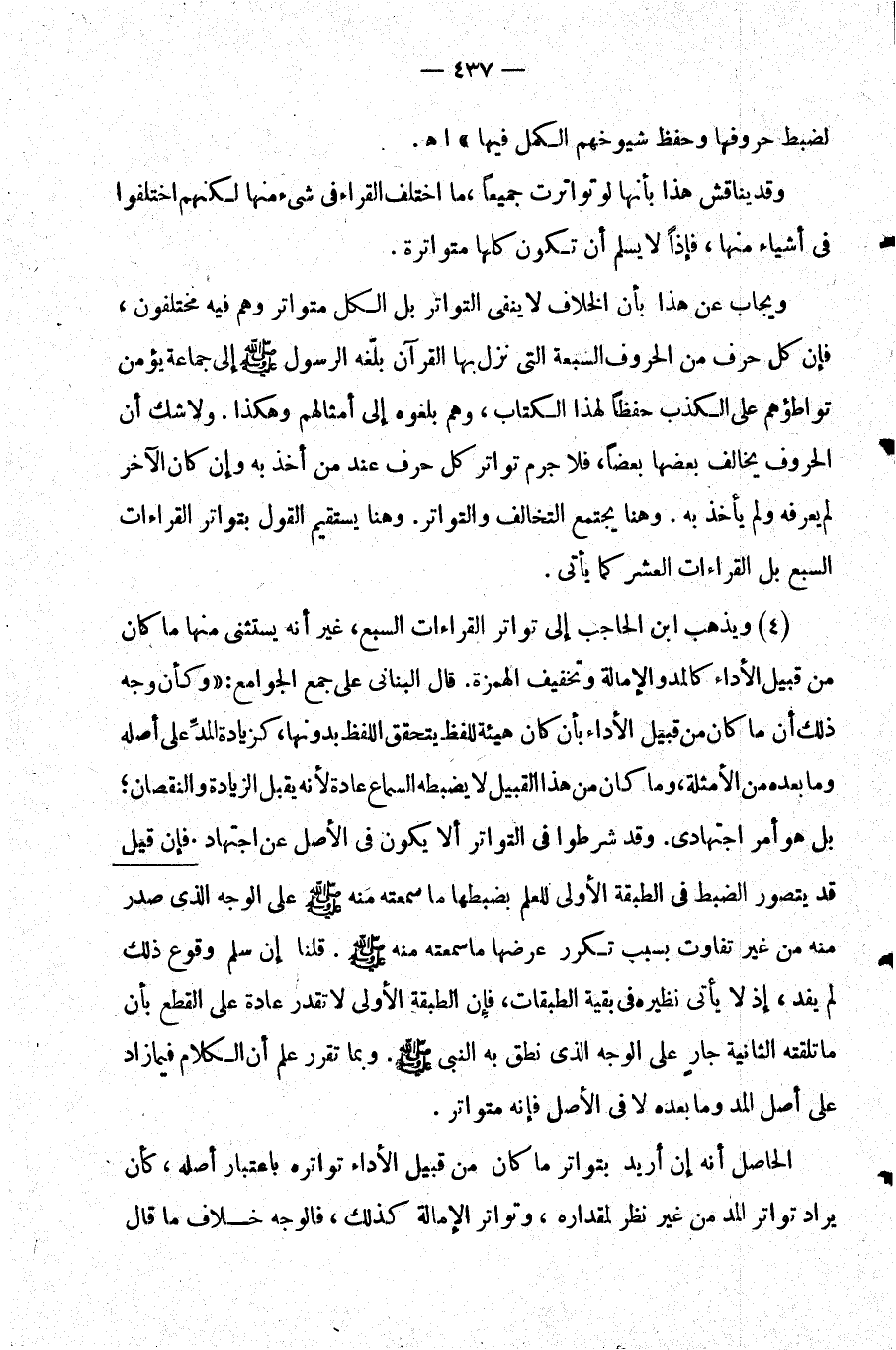 4- ويذهب ابن الحاجب إلى تواتر القراءات السبع غير أنه يستثني منها ما كان من قبيل الأداء كالمد والإمالة وتخفيف الهمزة. قال البناني على جمع الجوامع: وكأن وجه ذلك أن ما كان من قبيل الأداء بأن كان هيئة للفظ يتحقق اللفظ بدونها كزيادة المد على أصله وما بعده من الأمثلة وما كان من هذا القبيل لا يضبطه السماع عادة لأنه يقبل الزيادة والنقصان بل هو أمر اجتهادي. وقد شرطوا في التواتر ألا يكون في الأصل عن اجتهاد. فإن قيل قد يتصور الضبط في الطبقة الأولى للعلم بضبطها ما سمعته منه صلى الله عليه وسلم على الوجه الذي صدر منه من غير تفاوت بسبب تكرر عرضها ما سمعته منه صلى الله عليه وسلم. قلنا إن سلم وقوع ذلك لم يفد إذ لا يأتي نظيره في بقية الطبقات فإن الطبقة الأولى لا تقدر عادة على القطع بأن ما تلقته الثانية جار على الوجه الذي نطق به النبي صلى الله عليه وسلم. وبما تقرر علم أن الكلام فيما زاد على أصل المد وما بعده لا في الأصل فإنه متواتر.