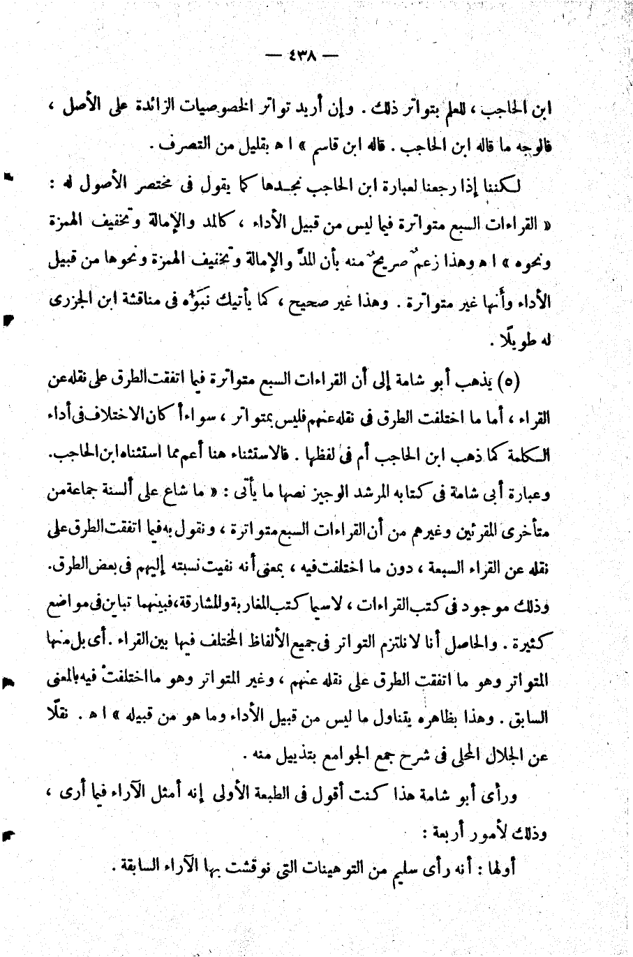 5- يذهب أبو شامة إلى أن القراءات السبع متواترة فيما اتفقت الطرق على نقله عن القراء أما ما اختلفت الطرق في نقله عنهم فليس بمتواتر سواء أكان الاختلاف في أداء الكلمة كما ذهب ابن الحاجب أم في لفظها. فالاستثناء هنا أعم مما استثناه ابن الحاجب. وعبارة أبي شامة في كتابه المرشد الوجيز نصها ما يأتي: ما شاع على ألسنة جماعة من متأخري المقرئين وغيرهم من أن القراءات السبع متواترة ونقول به فيما اتفقت الطرق على نقله عن القراء السبعة دون ما اختلفت فيه بمعنى أنه نفيت نسبته إليهم في بعض الطرق. وذلك موجود في كتب القراءات لا سيما كتب المغاربة والمشارقة فبينهما تباين في مواضع كثيرة. والحاصل أنا لا نلتزم التواتر في جميع الألفاظ المختلف فيها بين القراء. أي بل منها المتواتر وهو ما اتفقت الطرق على نقله عنهم وغير المتواتر وهو ما اختلفت فيه بالمعنى السابق. وهذا بظاهره يتناول ما ليس من قبيل الأداء وما هو من قبيله اهـ. نقلا عن الجلال المحلي في شرح جمع الجوامع بتذييل منه.