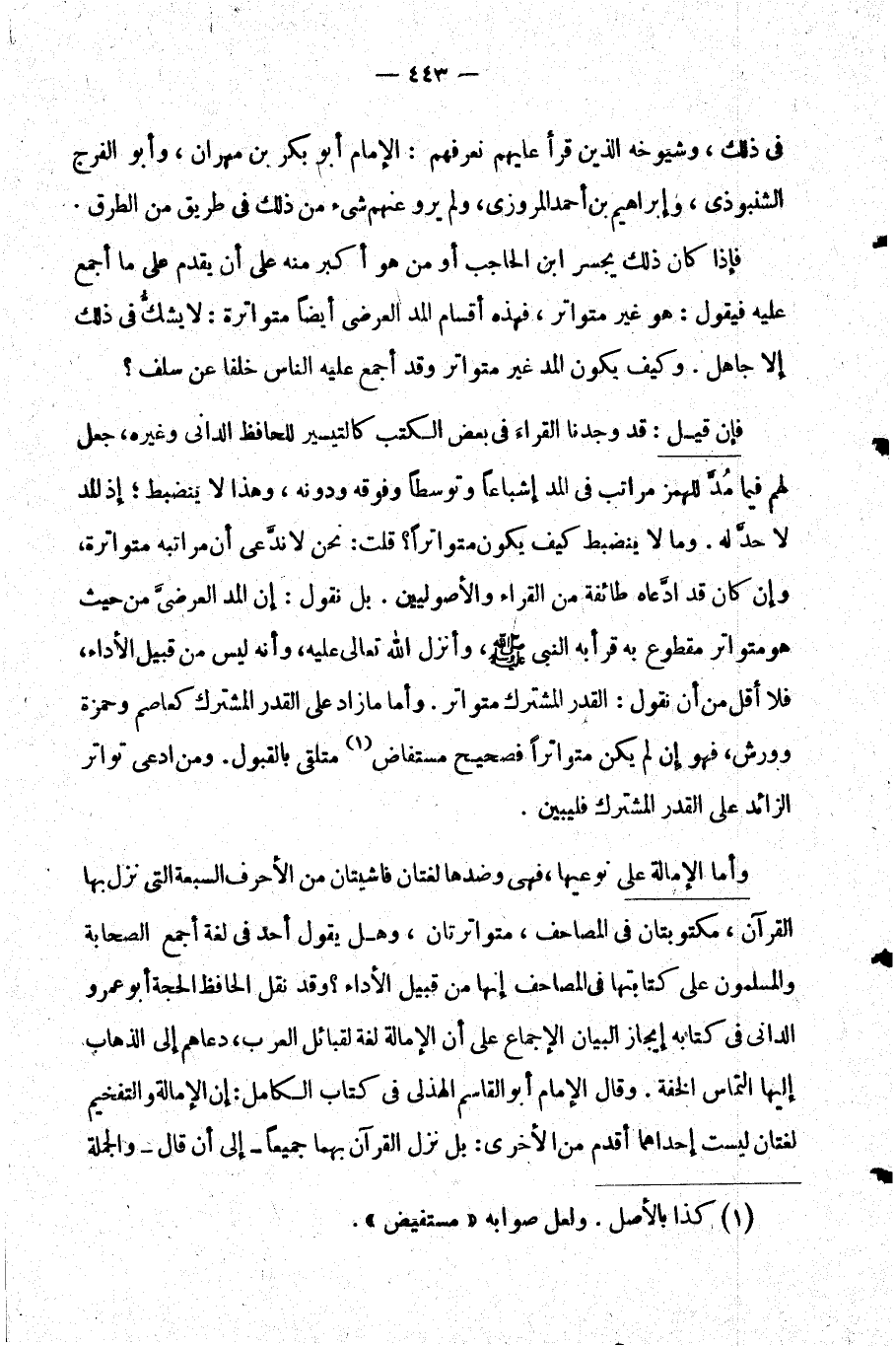 فإذا كان ذلك يجسر ابن الحاجب أو من هو أكبر منه على أن يقدم على ما أجمع عليه فيقول: هو غير متواتر فهذه أقسام المد العرضي أيضا متواترة: لا يشك في ذلك إلا جاهل. وكيف يكون المد غير متواتر وقد أجمع عليه الناس خلفا عن سلف؟