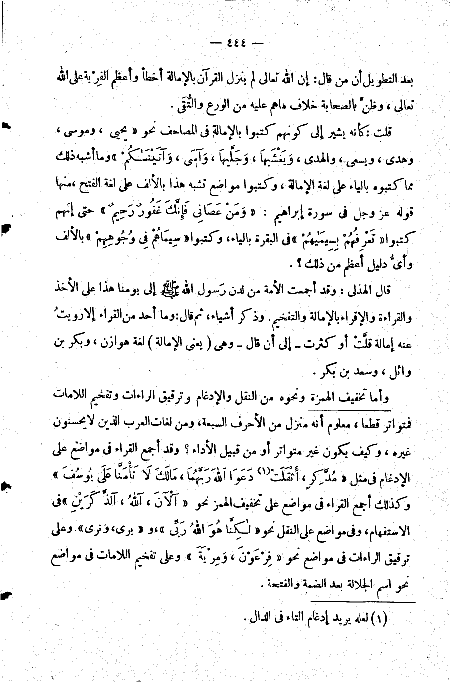 بعد التطويل أن من قال إن الله تعالى لم ينزل القرآن بالإمالة أخطأ وأعظم الفرية على الله تعالى وظن بالصحابة خلاف ما هم عليه من الورع والتقى.