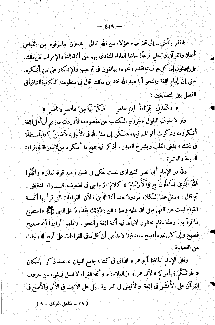 فانظر يا أخي إلى قلة حياء هؤلاء من الله تعالى. يجعلون ما عرفوه من القياس أصلا والقرآن العظيم فرعا حاشا العلماء المتقدى بهم من أئمة اللغة والإعراب من ذلك. بل يجيئون إلى كل حرف مما تقدم ونحوه يبالغون في توجيهه والإنكار على من أنكره. حتى إن إمام اللغة والنحو أبا عبد الله محمد بن مالك قال في منظومته الكافية الشافية في الفصل بين المتضايفين: