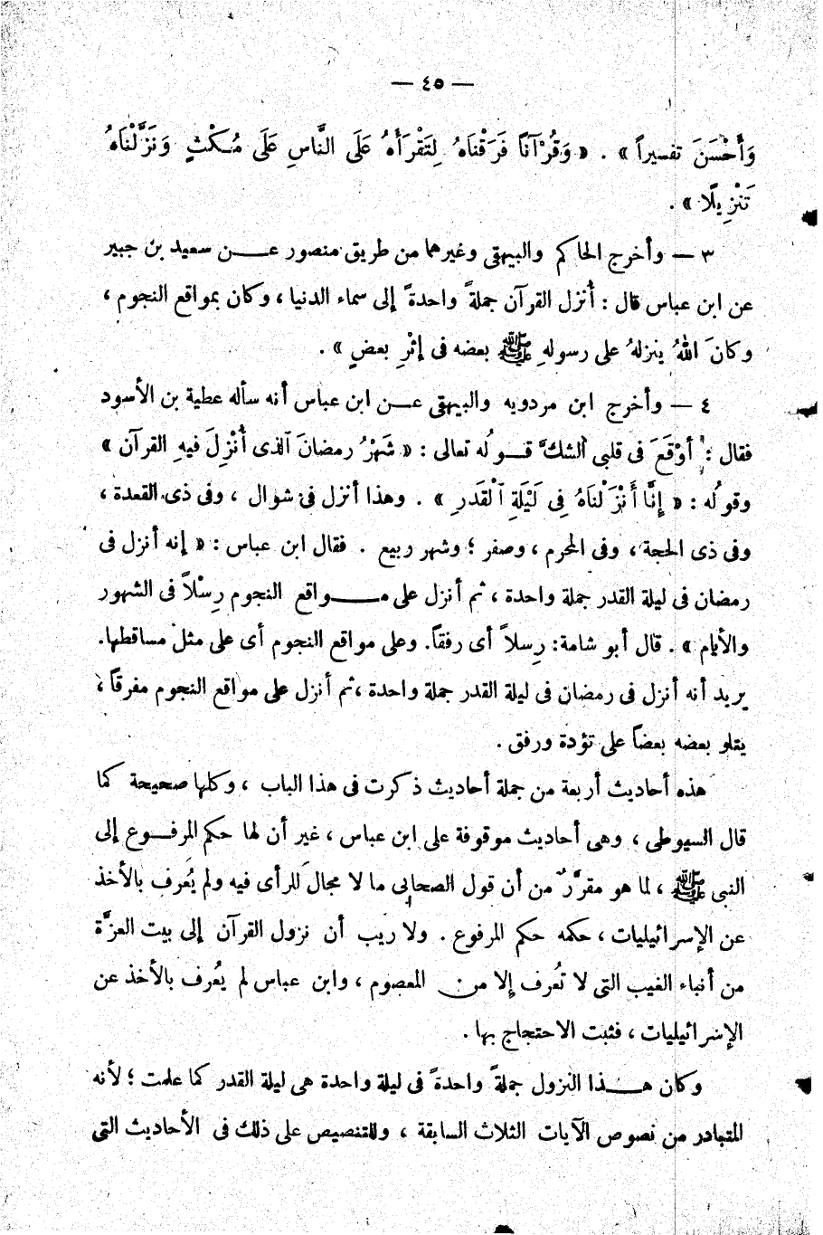 3- وأخرج الحاكم والبيهقي وغيرهما من طريق منصور عن سعيد بن جبير عن ابن عباس قال: أنزل القرآن جملة واحدة إلى سماء الدنيا وكان بمواقع النجوم وكان الله ينزله على رسوله صلى الله عليه وسلم بعضه في إثر بعض.