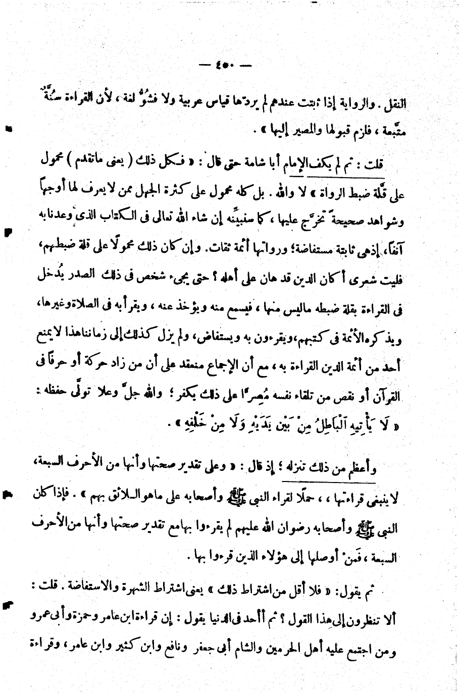 قلت: ثم لم يكف الإمام أبا شامة حتى قال: فكل ذلك يعني ما تقدم محمول على قلة ضبط الرواة لا والله. بل كله محمول على كثرة الجهل ممن لا يعرف لها أوجها وشواهد صحيحة تخرج عليها كما سنبينه إن شاء الله تعالى في الكتاب الذي وعدنا به آنفا إذ هي ثابتة مستفاضة ورواتها أئمة ثقات. وإن كان ذلك محمولا على قلة ضبطهم فليت شعري أكان الدين قد هان أهله؟ حتى يجيء شخص في ذلك الصدر يدخل في القراءة بقلة ضبطه ما ليس منها فيسمع منه ويأخذ عنه ويقرأ به في الصلاة وغيرها ويذكره الأئمة في كتبهم ويقرؤون به ويستفاض ولم يزل كذلك إلى زماننا هذا لا يمنع أحد من أئمة الدين القراءة به مع أن الإجماع منعقد على أن من زاد حركة أو حرفا في القرآن أو نقص ما تلقاء نفسه مصرا على ذلك يكفر والله جل وعلا تولى حفظه: {لا يَأْتِيهِ الْبَاطِلُ مِنْ بَيْنِ يَدَيْهِ وَلا مِنْ خَلْفِهِ} .