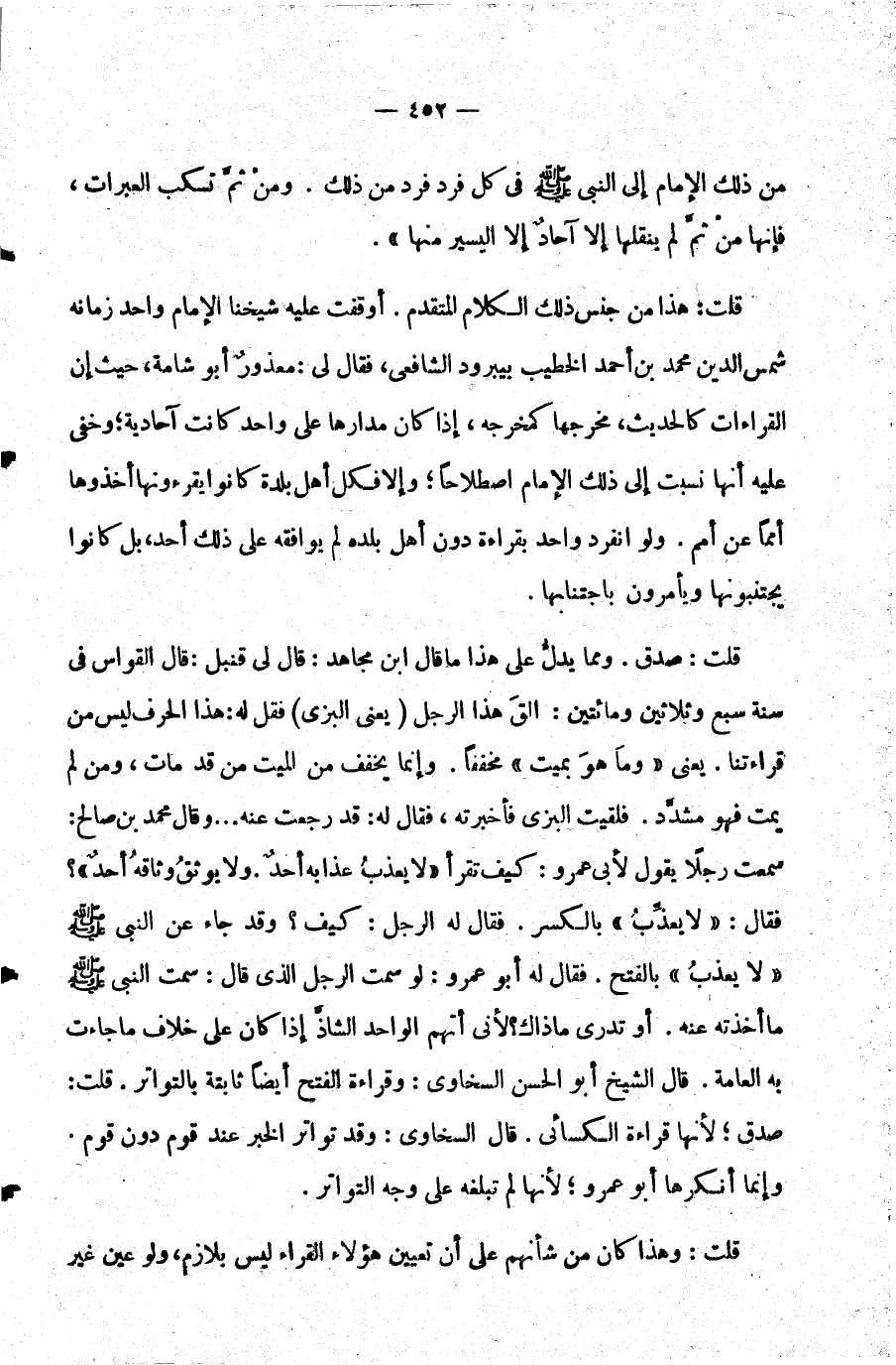 قلت: هذا من جنس ذلك الكلام المتقدم. أوقفت عليه شيخنا الإمام واحد زمانه شمس الدين محمد بن أحمد الخطيب بيبرود الشافعي فقال لي: معذور أبو شامة حيث إن القراءات كالحديث مخرجها كمخرجه إذا كان مدارها على واحد كانت آحادية وخفي عليه أنها نسبت إلى ذلك الإمام اصطلاحا وإلا فكل أهل بلدة كانوا يقرؤونها أخذوها أمما عن أمم. ولو انفرد واحد بقراءة دون أهل بلده لم يوافقه على ذلك أحد بل كانوا يجتنبونها ويأمرون باجتنابها.