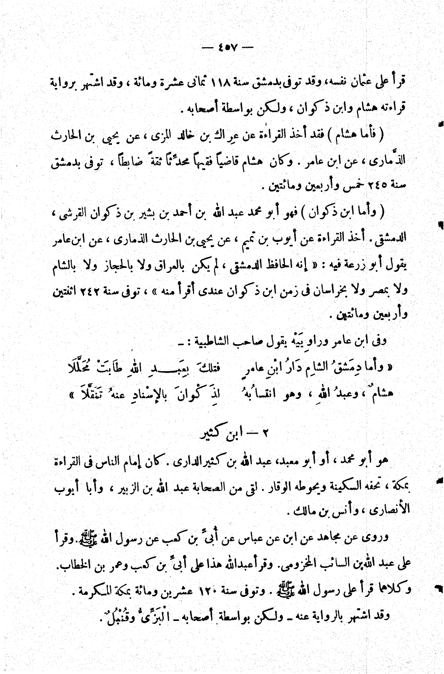 وأما ابن ذكوان فهو أبو محمد عبد الله بن أحمد بن بشير بن ذكوان القرشي الدمشقي. أخذ القراءة عن أيوب بن تميم عن يحيى بن الحارث الذماري عن ابن عامر يقول أبو زرعة فيه: إنه الحافظ الدمشقي لم يكن بالعراق ولا بالحجاز ولا بالشام ولا بمصر ولا بخراسان في زمن ابن ذكوان عندي أقرأ منه توفي سنة 242 اثنتين وأربعين ومائتين.